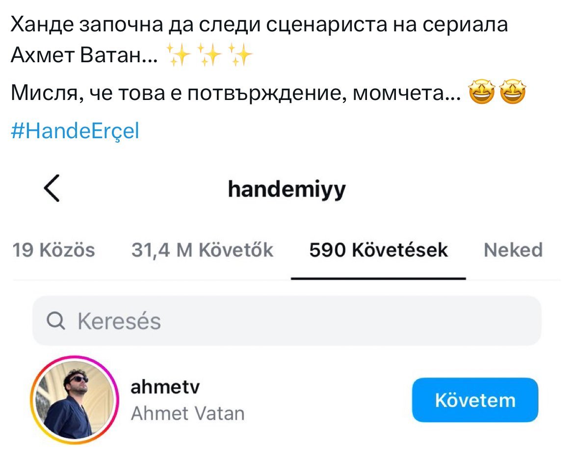 Сега обаче се обаждам по повод "бомбата" за личния живот на Керем. Признавам си (пък май го и писах тогава), че трудно приех раздялата му с Ханде. Ама с времето осъзнах, че съм си изградила своя представа за тази двойка и трудностите ми идват от разминаването с представата ми. И ... престанах да пиша по въпроса, четях ви. И общо взето, мога да кажа, че Ханде - Хакан с времето ги захаресвах, поне това, което показват напоследък. Нито Ханде е бедно девойче, та да ламти за пари в една връзка, нито Хакан до тук е показал неуважение. А кой колко и как обича е съвсем друг въпрос. Няма симетрична любов.