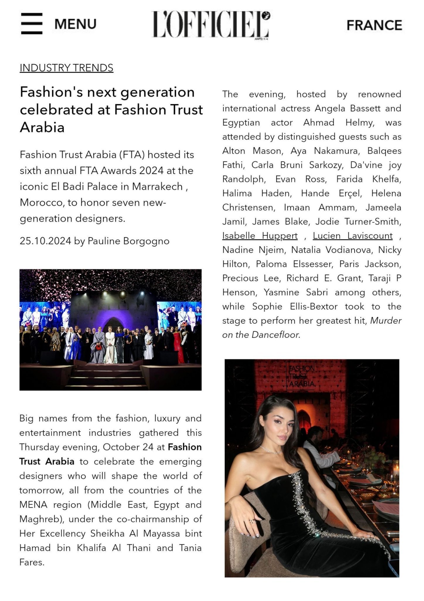 Ханде Ерчел беше спомената в статията на списание L'OFFICIEL PARIS: „Следващото поколение мода беше отбелязано в Fashion Trust Arabia“
