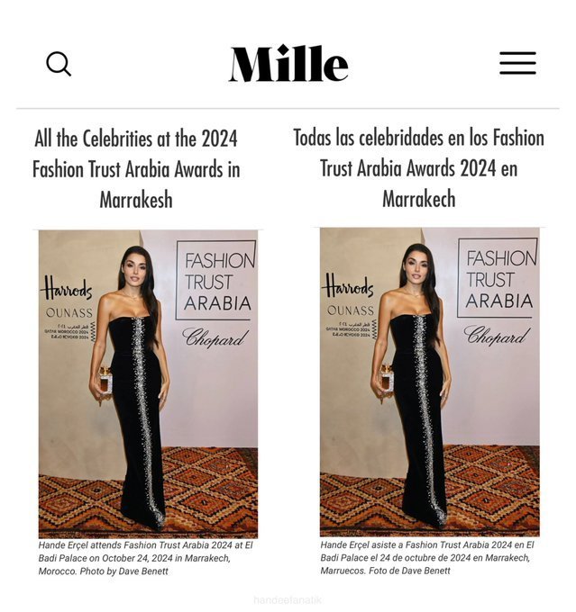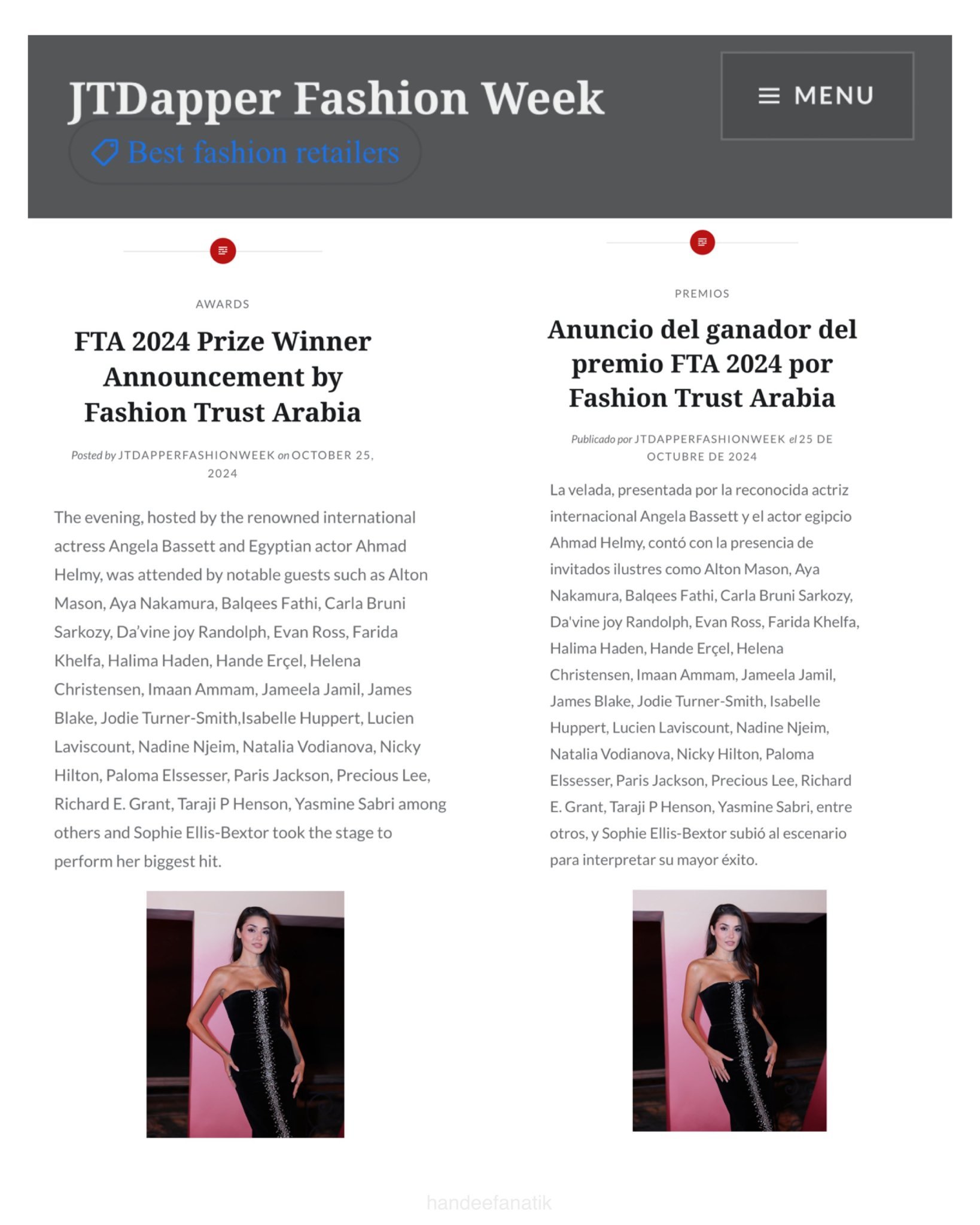 Ханде Ерчел беше спомената като един от видните гости на FTA в статията, написана от JTDapper Fashion Week: „Обявяване на победителя в наградата FTA 2024 от Fashion Trust Arabia“.