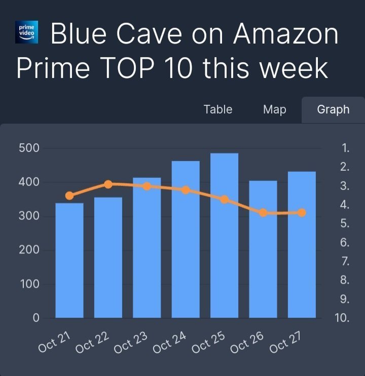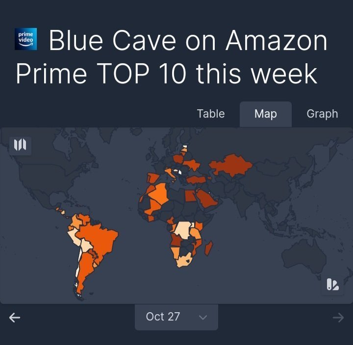 "Синята пещера, който привлече голямо внимание от първия ден на пускането си, стана 3-ият най-гледан филм в света на Amazon Prime, според данни от 27.10.2024 г."