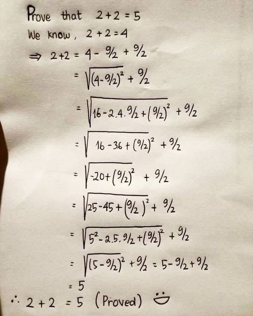 Една забавна задача от нета /не е училищна, не е спешно, стана ми интересно /, ако някой има време и ако може да обясни къде е грешката 2+2=5