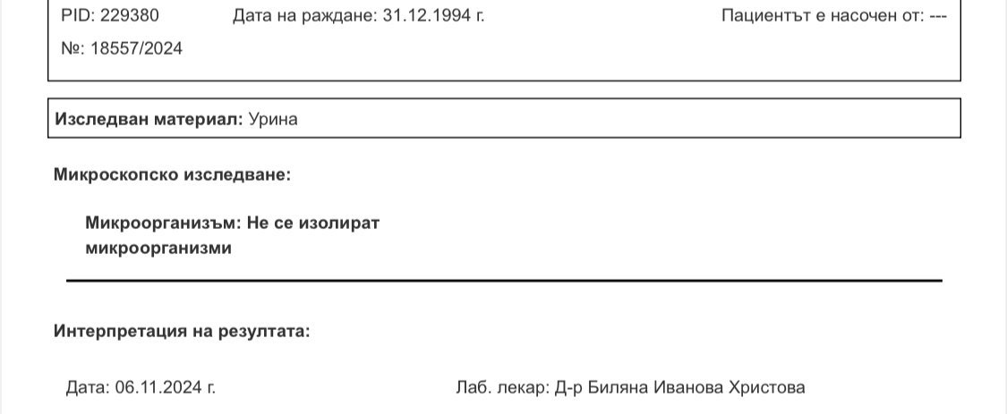 Здравейте, пак съм аз с моята стерилна урина. Не знам какви резултати да очаквам, а от вчера в приложението резултата стои така (прилагам снимка). Това ли е или все още не е актуализирано?