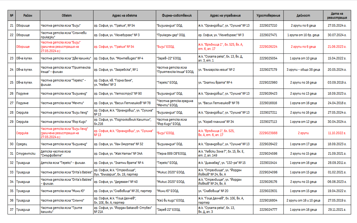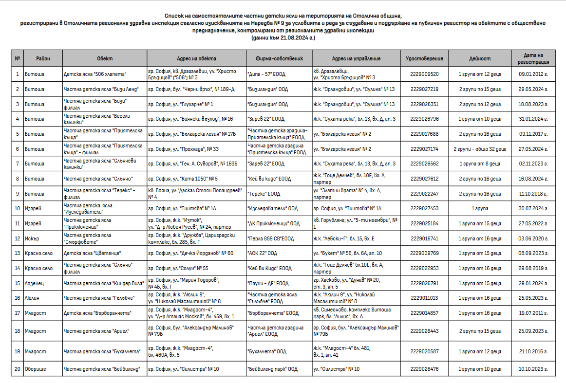 Списък на самостоятелни частни детски ясли, регистрирани в СРЗИ - дават 1т. при кандидатстване за 1-ва градинска група (при посещение на яслата най-малко 6 месеца от последните 12 месеца към датата на класиране):