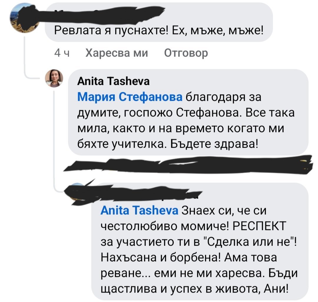 Коментарите на учителката са потрес, ако това е нивото на сегашните учители, нямам думи. Вместо да се държат достойно и навън, и онлайн, и да дават пример, такива махленски коментари.
