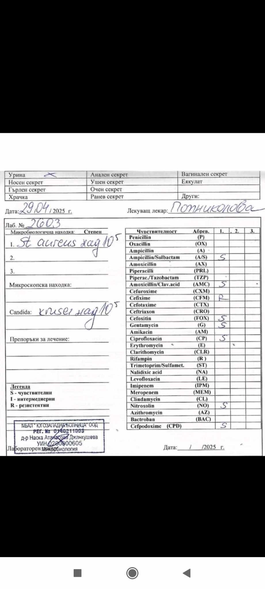 Ти освен разни особени щамове гъби, си имала и БВ, и стафилококи. Което не ме учудва предвид това, че нямаш никакви лактобацили, а явно не са ти изписвали да слагаш такива.