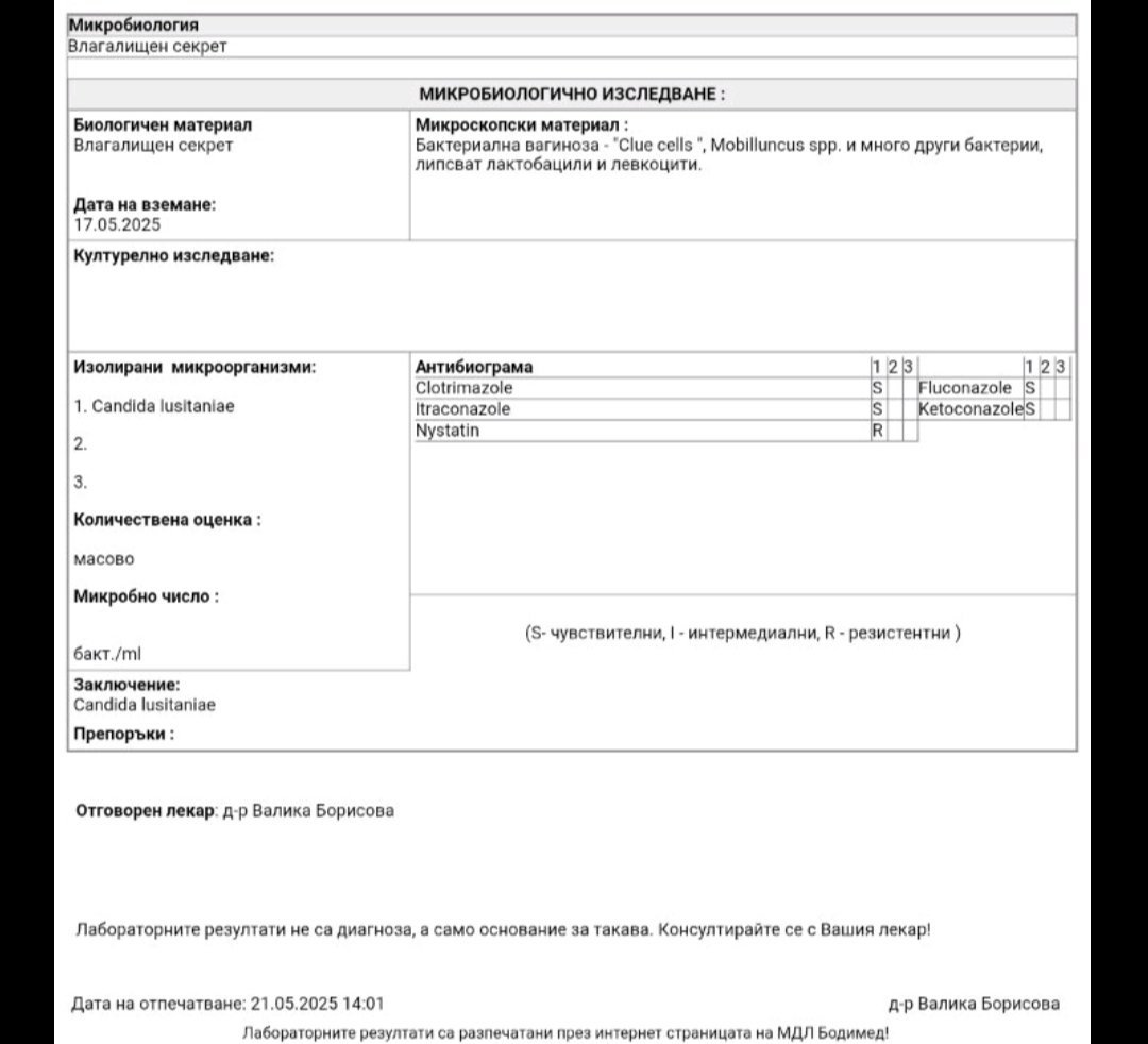 Здравей не съм от София и е съм правила такова изследване. Гинеколожката взе секрет и го гледа директно под микроскоп. Изследвала съм инсулинова резистентност тъй като мислеше че проблема е от там. С изключително срината имунна система съм след огромен прием на антибиотици в голям период от време. То и след тях се появи проблема.Тъй като в момента съм и със счупен крак вариант за преглед нямам. Посаветва ме да си взема Гиназол и да се на мажа с него и външно. ДА Продължа и с гинофилус.