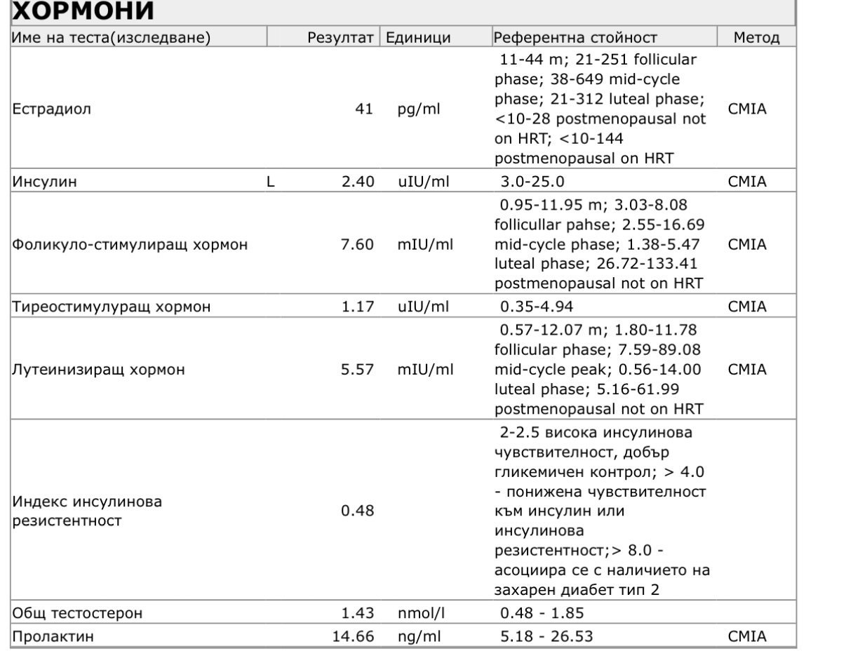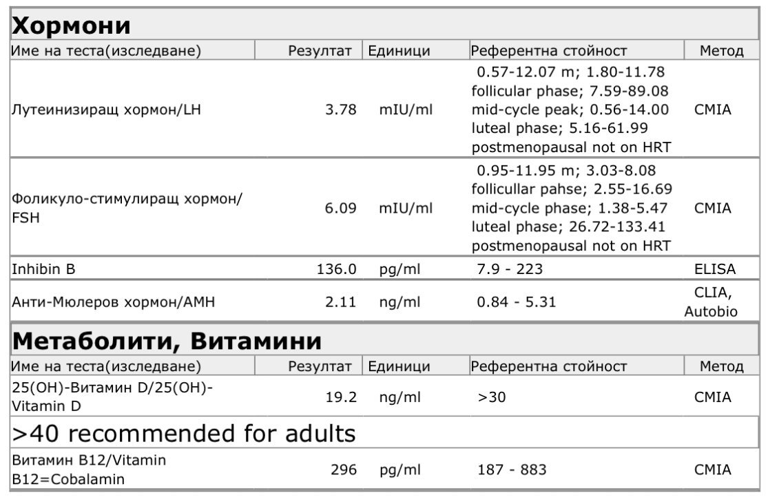 Относно хормоните - избрах пакет на Рамус (Яйчников резерв), в който бяха включени само АМH, FSH и LH. Добавих и Inhibin B..
