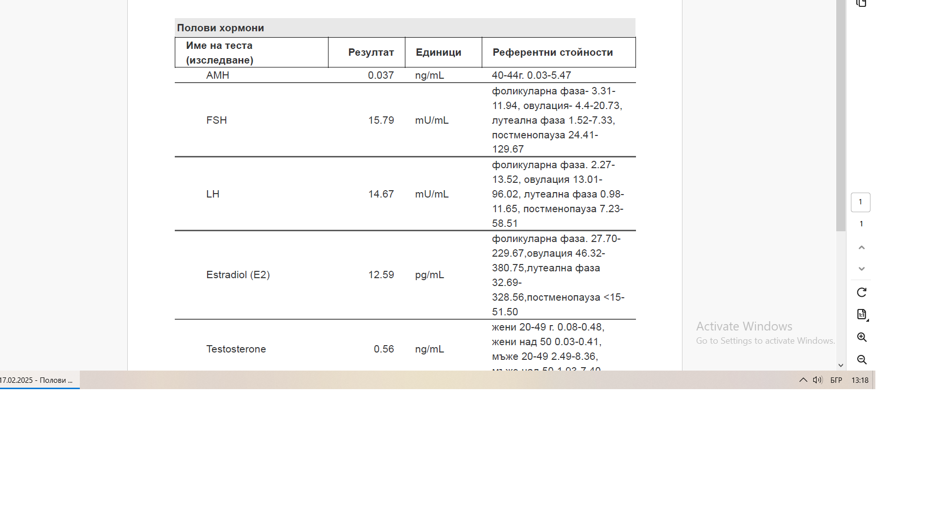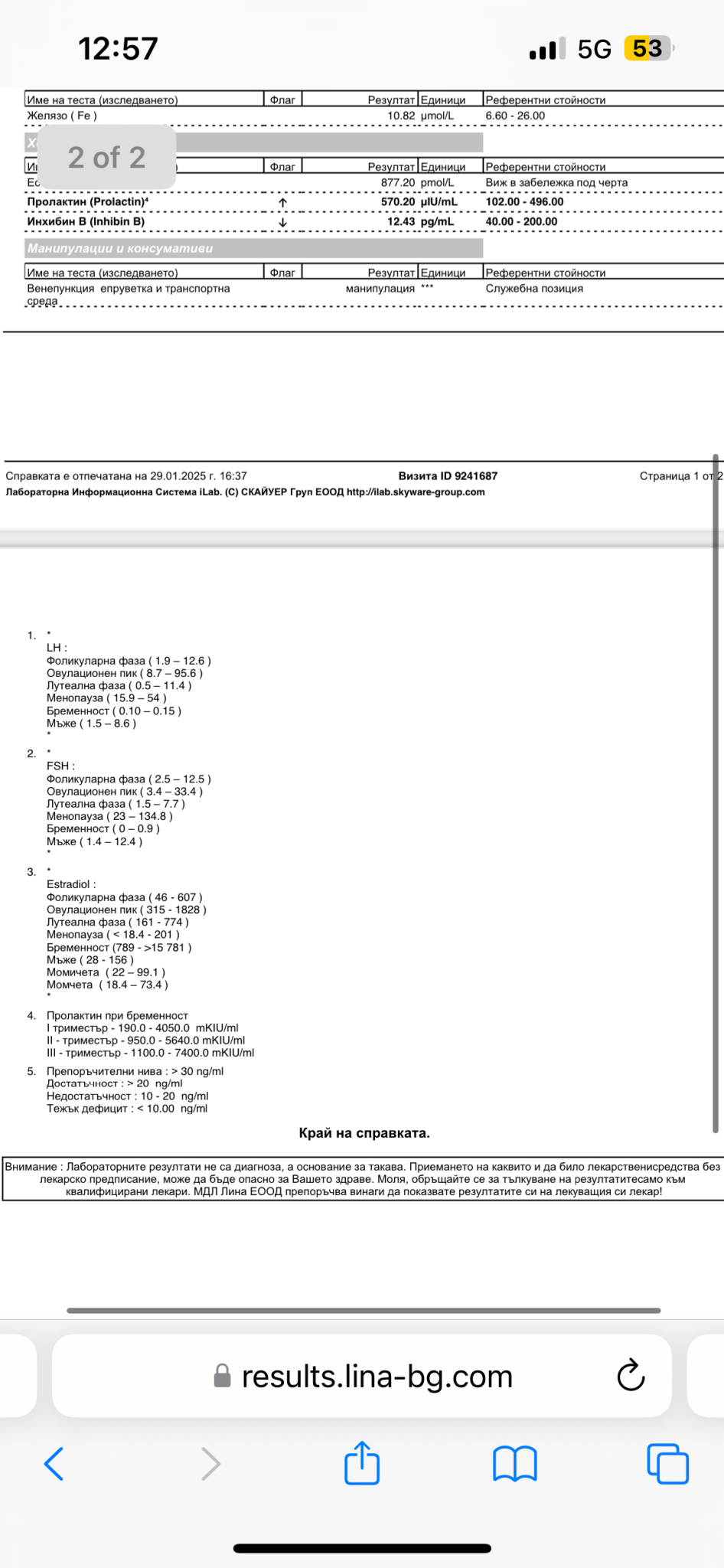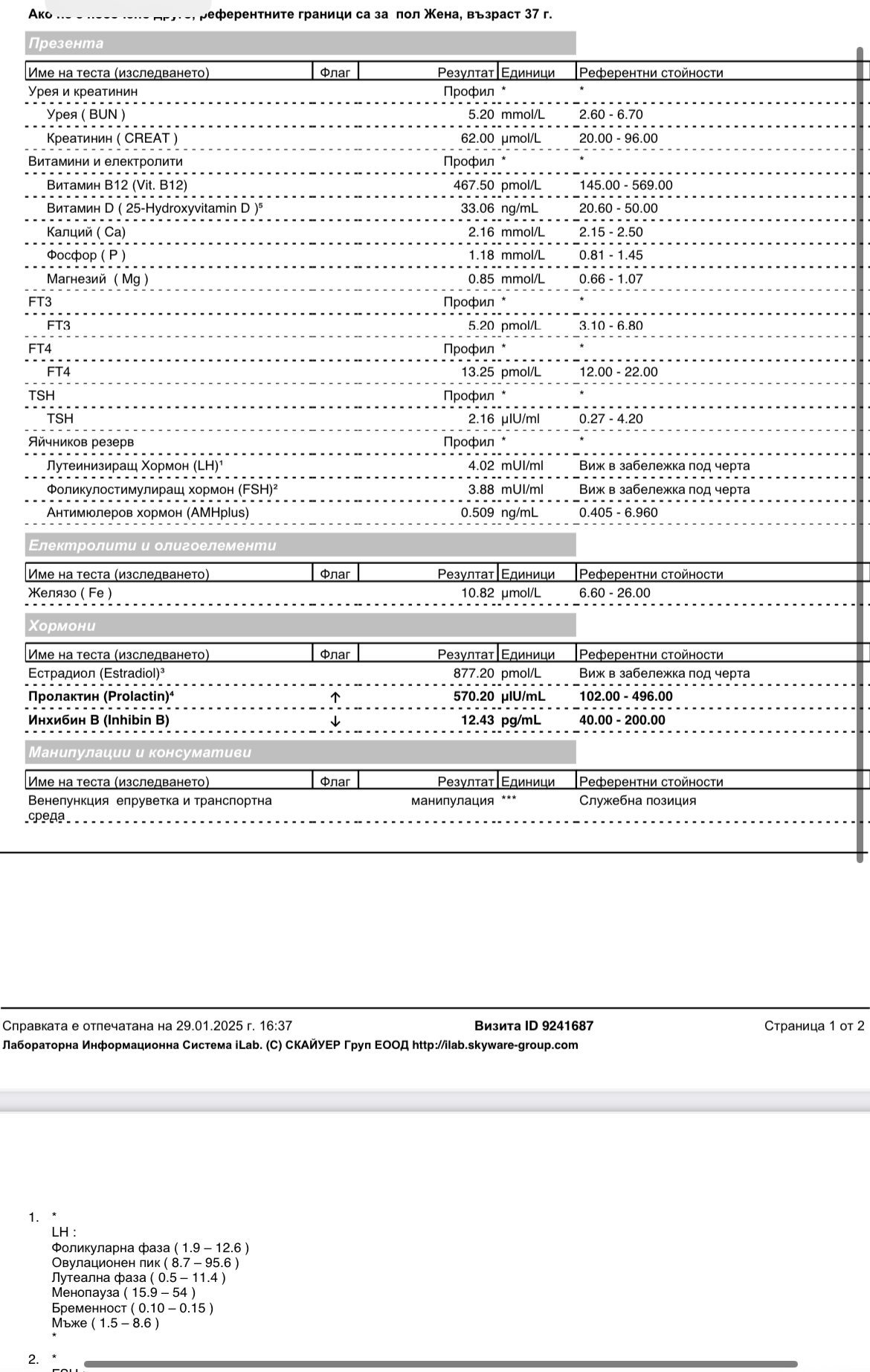 Здравей Денис,би ли ми помогнала с мойте резултати(3ти ден от МЦ,който винаги ми беше на 28 дни,сега понякога е 26).На 37 години съм,преди година ми откриха малък миомен възел а предния месец малка киста 3см,сега е 2см. Лекуваме уреаплазма уреалитикум,микоплазма хоминис и гарднерела с антибиотик по антибиотрама,пореден курс. хормоните ми значително са се влошили от година насам. Гинеколога не ми е изписал нищо за регулирането им,към инвитро специалист ли да се обърнем,като се тестваме отново за плазмите? На втората страница горе е Естрадиол хормона,който не се вижда добре.Моля те за разчитане и има ли какво да пия освен витамини и имунистимуланти за да подпомогна организма си и регулирам тези хормони.