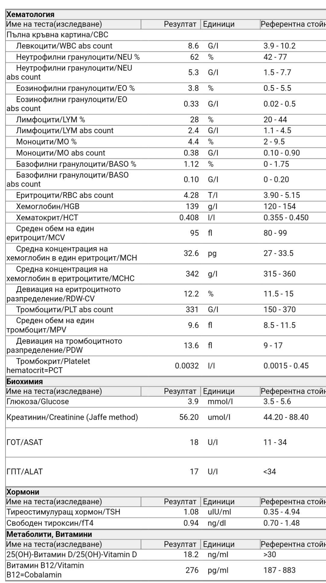 В12 е нисък, трябва да е на горна граница ( 850 напр.) - провери ФК, В6 и Хомоцистеин.