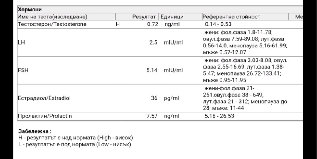 Тестостеронът е висок, това не е Ок. Провери селен, цинк и мед... направи тест за ИР... провери Андростендион, ДХЕА и 17ОН Прогестерон, точно на 3 ден от МЦ и се консултирай с Ендокринолог.