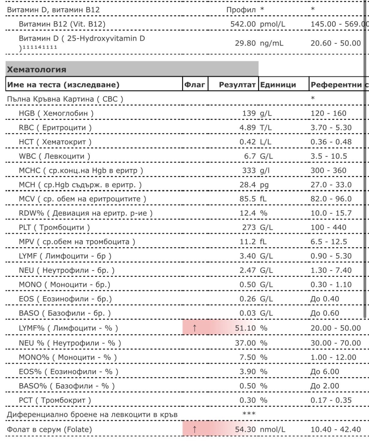 Здравейте отново! Прилагам отново резултатите си, защото днес излязоха Б12, вит Д и фолиева киселина. Май фолиевата трябва да я спра за повече от тази седмица пауза, която направих…
