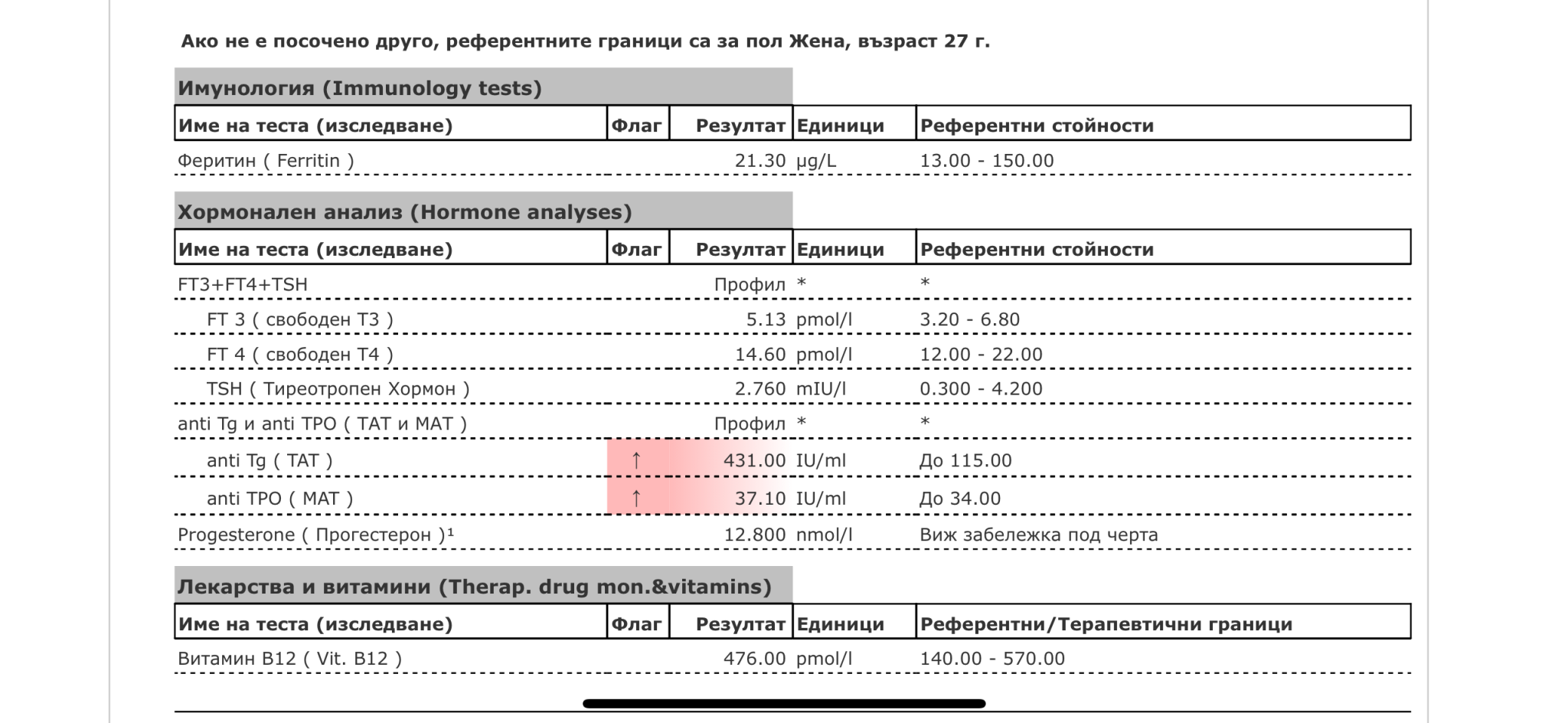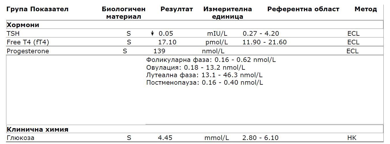 Здравей, denis! Бих помолила за коментар на изследванията ми, бременна съм след инвитро в 12та седмица + 3 дни. приемам еутирокс заради хашимото с хипофункция, като на доза 6х75 + 1х100 имах добри щитовидни показатели преди 30 дни, но допускам че заради спирането на естрофем (последното хапче го пих в събота), TSH доста е паднало. Относно глюкозата, по принцип ям плодове, мед, тестено, но не ям никакво сладко като шоколади, вафли, торти. А относно прогестерона, в момента съм на утрогестан 2х2 от 100 мг, като поетапно ще го спра окончателно до началото на следващата седмица по предписана схема. Днес съм на ендокринолог за коментар, но много ще се радвам на твоето мнение и дали с тези щитовидни нещата са наред с бебчо... благодаря!