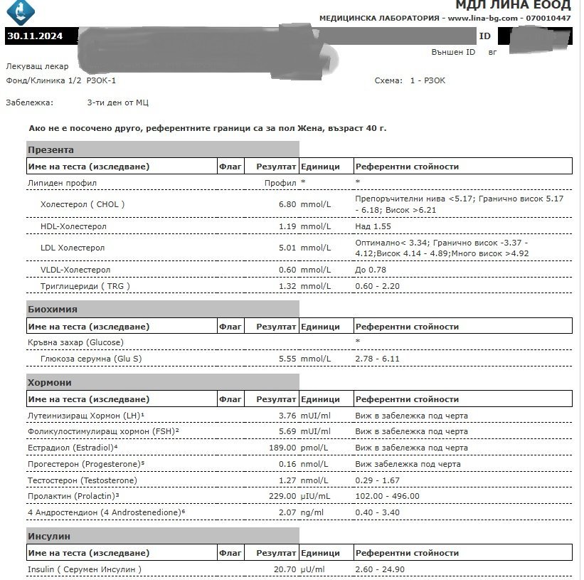 Жена, 40 год., с наднормено тегло, половите хормони са правени на 3-ти ден от МЦ.