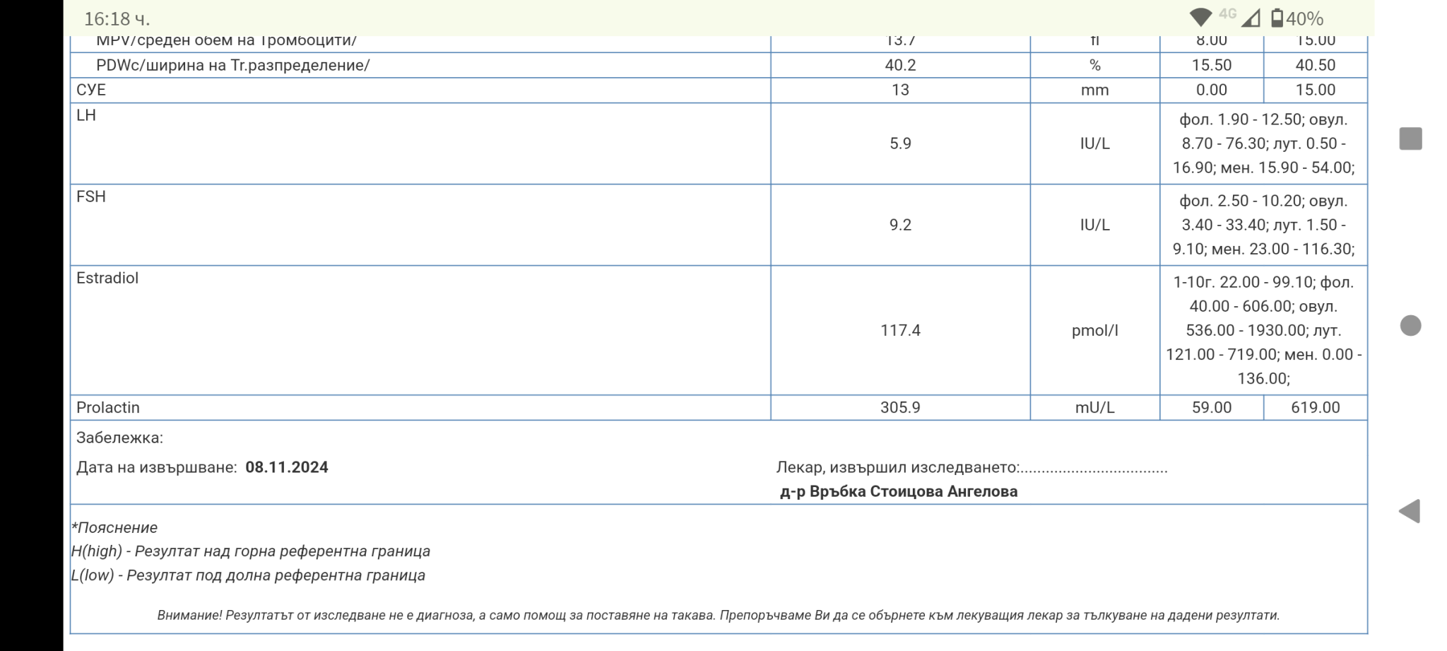 Здравейте на всички. Ще съм благодарна на Денис за коментар за тези хормони. Искам да поясня, че ще ги повторя, защото са пуснати на 5 ден от мц. На 34г съм, нямам засега деца, а точно това е целта-бременност. Предстои ми махане на полип на маточната шийка. Притеснявам се, че съм в предменопауза с тези хормони.