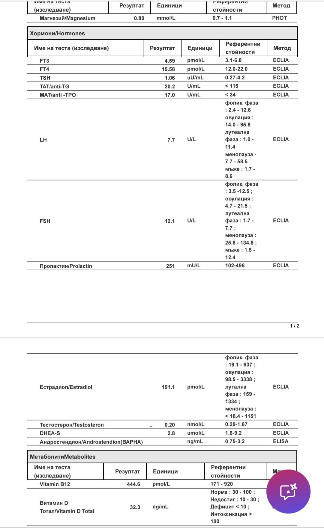 Благодаря ти Денис,ти си златна. Желая на теб и на всички една здрава и ползотворна година изпълнена с хубави новини и моменти. Наистина се успокоих. Просто другаде ми казаха, че с тези нива на фсх,лх(трябвало да бъдат до 2 и съотношението трябва да бъде 1:1 или 1:1.5,не съм наясно с подробности, но наистина ме е страх, че времето изтича. Другото, което забравих да спомена в първият ми пост е, че за година и 7,8 месеца амх ми беше 3.74. Възможно ли е да е паднал поради тази причина че съм в в ранна предменопауза изобщо как мога да разбера дали съм в такава. )и е3  съм в предменопауза и изведнъж светът ми се срина. Ще ги повторя пак на третия ден от мц и пак ще кача резултатите. Но искам да попитам ако си болен(грип, настинка) може ли да се правят хормонални изследвания или е добре първо да си здрав и тогава.