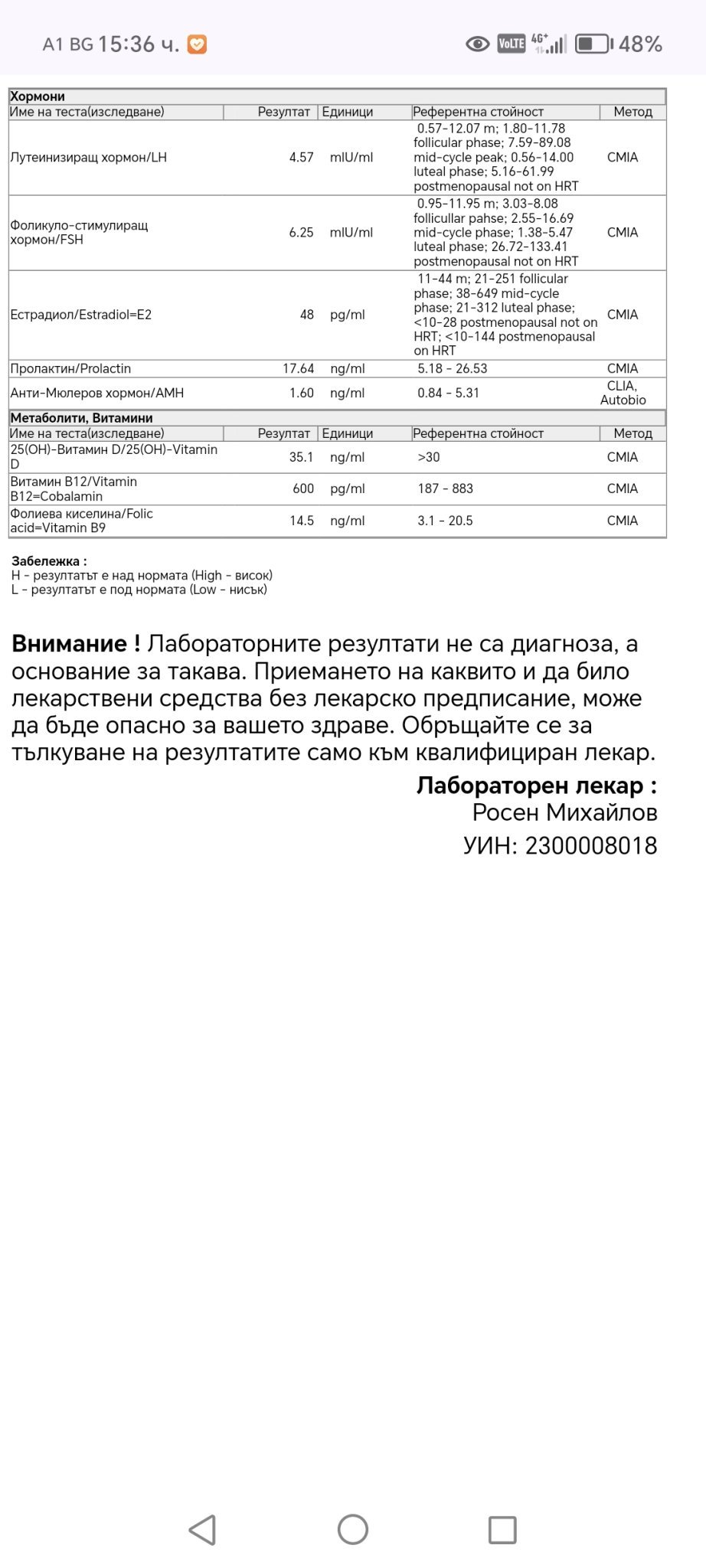 Моля за мнение по следните резултати, които са правени на 5ти ден от МЦ, на 23г. Приемам витамин Д и Б комплекс отделно.
