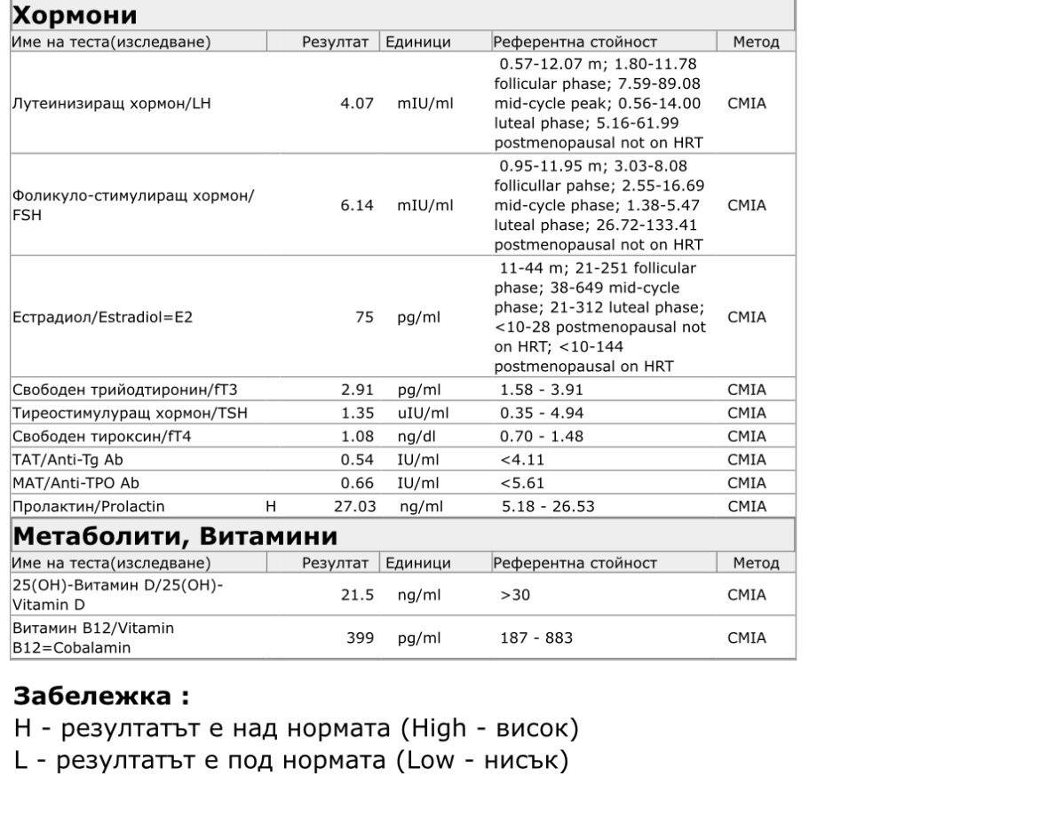 Здравей, Денис! На 37 г. съм имам едно момче на близо 5 г. От една година правим опити за бебе, като имах миналата година и един аборт. Бях на репродуктивни специалист, който ми даде да изследвам хормони, като каза от 2 до 5 - ти ден на М, аз ги изследвах на 5-ти ден, може ли да направиш коментар на резултатите?