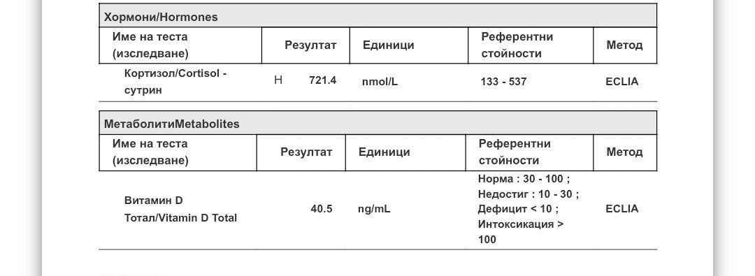 Денис, моля те за кратък коментар за високия кортизол. Винаги съм имала съмнения (качих около 10 кг.  последните две години, покрай инвитро стимулации-общо 4 на брой , и от тогава какво и да направя не мога да сваля кг., имам ИР приемам глюкофаж, постоянно чувствам тревожност и безпокойство) поддържам вит Д с вигантол по 10 капки на ден, и пак е в ниска стойност.