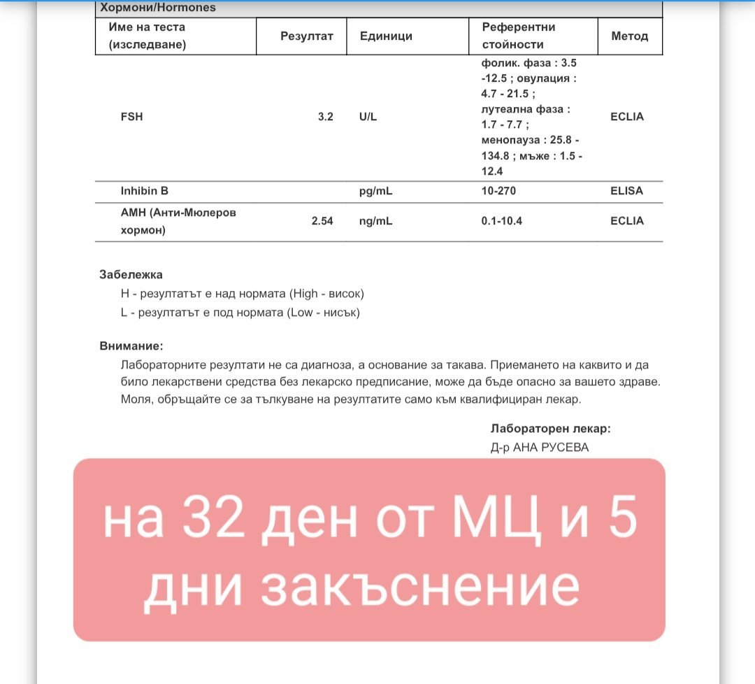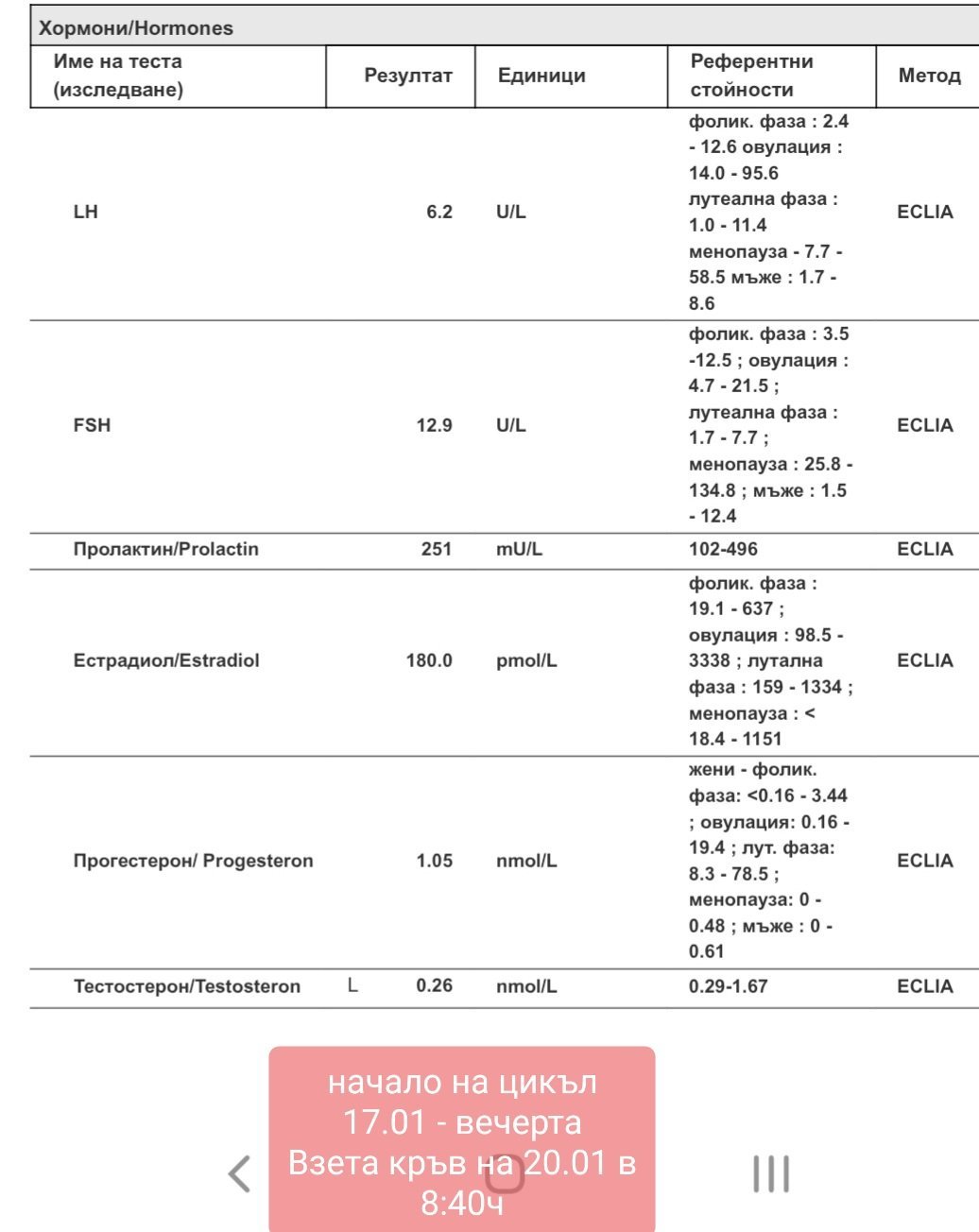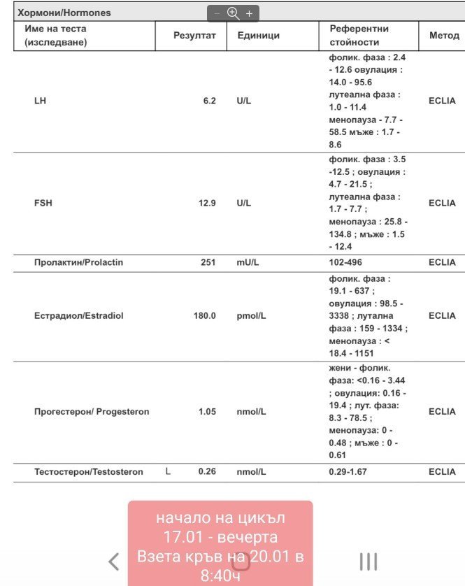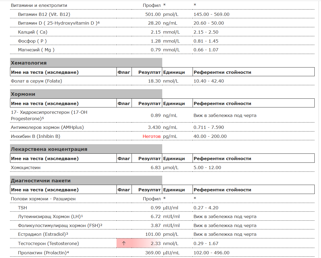 Денис, моля, когато е удобно да коментираш и тези изследвания. Правени са точно на 3ти ден, жена 30г. Инхибин Б казаха чак другата седмица. По отношение на HOMA IR изследванията, правени са август. За ЩЖ също съм пускала тогава и всичко беше наред. Силно ме притеснява тестостерона сега. От известно време имам съмнения за ПКЯ - мазна кожа, акне, косопад, окосмяване, странно насищане на лентичките за овулация не когато трябва и в същото време много рядко съм хващала пик. Цикъл сравнително редовен - 27-30 дни. Не съм имала големи забавяния. От началото на месеца приемам MyO D-Chiro Inositol, L Arginine, NAC, Ubiquinol. Витамините ги спрях временно, за да пусна контрола, но и преди това не бях особено редовна с вит. Д, поради което пак е на дъното почти.