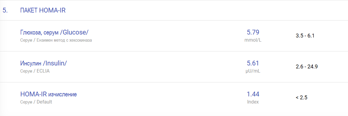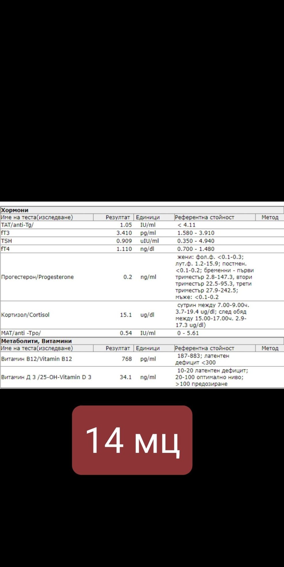 казаха чак другата седмица. По отношение на HOMA IR изследванията, правени са август. За ЩЖ също съм пускала тогава и всичко беше наред. Силно ме притеснява тестостерона сега. От известно време имам съмнения за ПКЯ - мазна кожа, акне, косопад, окосмяване, странно насищане на лентичките за овулация не когато трябва и в същото време много рядко съм хващала пик. Цикъл сравнително редовен - 27-30 дни. Не съм имала големи забавяния. От началото на месеца приемам MyO D-Chiro Inositol, L Arginine, NAC, Ubiquinol. Витамините ги спрях временно, за да пусна контрола, но и преди това не бях особено редовна с вит. Д, поради което пак е на дъното почти.
