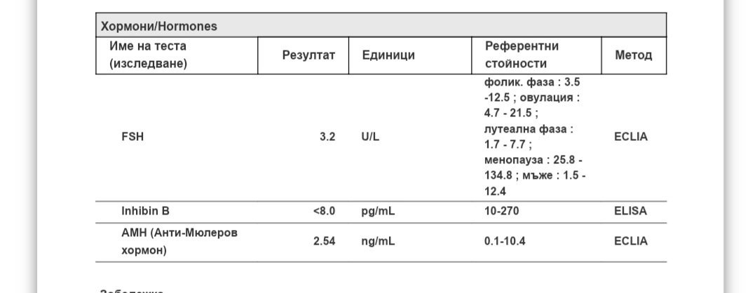В левия яйчник видя ендометриозна киста 16мм х 14 мм(като каза, че не е сигурен), а в десния хубав фоликул.  Проверих си прегледа след раждането, там също пише киста на левия яйчник 36 на 42 мм,а аз тотално бях забравила за това. Назначи ми изследвания, които публикувам тук и Ви моля за коментар. Инхибин-Б, ще бъде готов в сряда. В понеделник т.е. на 3ти ден от МЦ да аи пусна ли отново хормоните?