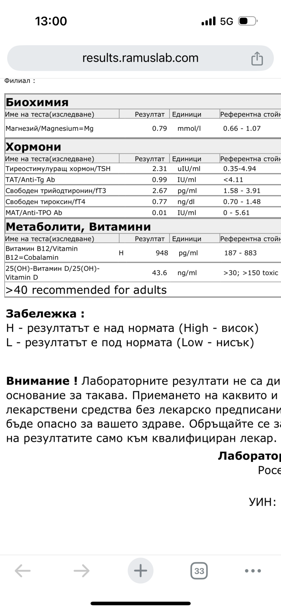 Здравейте, моля ви за мнение относно тези резултати. Пуснах ги, защото не се чувствам въобще добре, имам депресивни симптоми, с постоянно чувство за студ, отпадналост, наднормено тегло… и дозата имам чувството че ми е висока 100/125