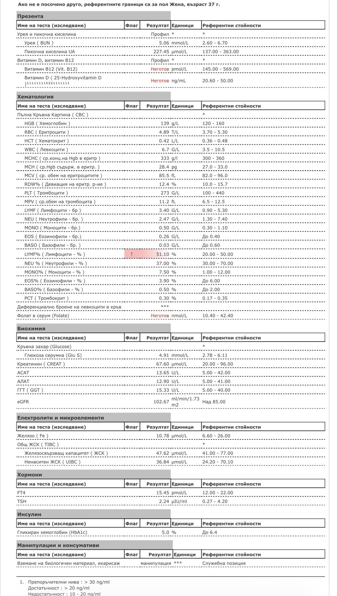 Прилагам резултати от изследванията, които правих днес. Витамините ще са готови в понеделник след 18 ч. чак, но до тогава ми беше интересно дали желязото не е прекалено ниско въпреки, че е в референтните стойности. Пускани са по повод много обилен косопад, но така или иначе планувам бременност ми беше интересно какво е настоящото положение в тялото ми. Също имам спомен, че ТСХ трябва да е под 2, а точно преди 3 месеца ендокринолога ми ми намали дозата на Л Тироксина от 75 на 50 и ето го пак е отхвръкнало…