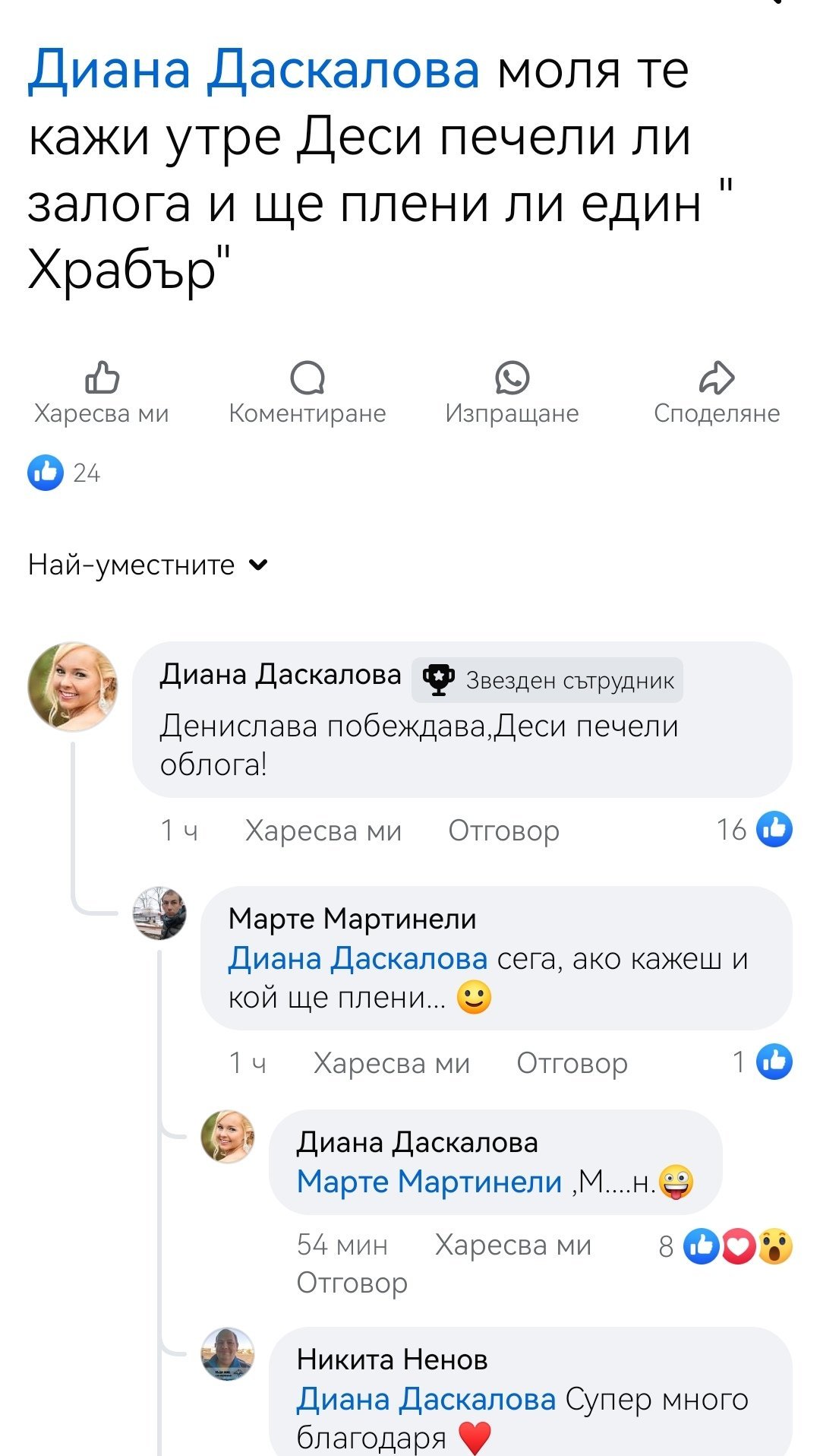 Добавили са го веднага. Администраторът благодари на Диана за инфото и публикува снимка на Мартин, че от другата седмица отива при Зелените Joy Не, този път не е копи пейст. Питат я различни въпроси, кой пада на капитанска, кой побеждава в елиминационна и т.н. и тя авторитетно отговаря. Някои и говорят на Вие и ѝ благодарят Joy