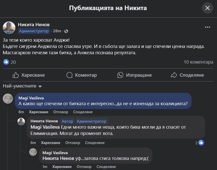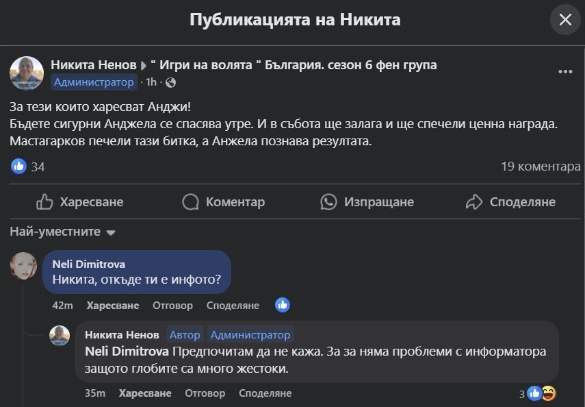 Добре де, аз едно не разбирам. Какъв ти е кефа да преписваш оттук и да пускаш във ФБ. Още повече, ако ти е фалшив профила, само работа си създаваш. Благодарим на Мери и Дидо, че ще ни спестяват напрежението по гледането и напразните надежди. Аз лично ми се искаше Силвия, а не Анджи да остане за финала. Тя е по-силна от нея, и едно висене на едни куки, не дава представа за това, кой е по-силен като играч. И за Малвина ми е тъпо, как падна.