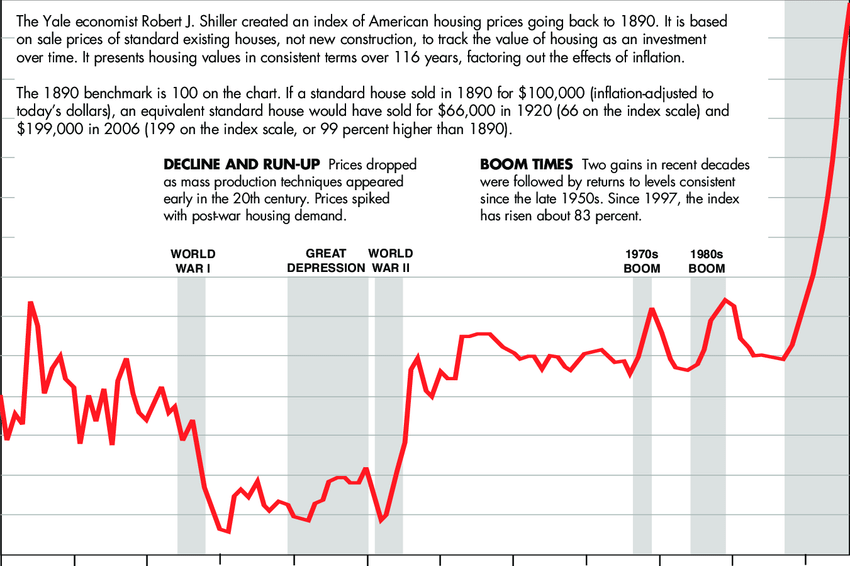 Това е една много популярна графика от интернет, илюстрираща периода от 19ти век до днес. Спадовете са по време на двете световни войни и Голямата депресия.  Освен трета световна война да настъпи… ако се учи, на мен лично цената на жилищата ще ми е последна грижа, но сигурно ще има и такива, които ще се зарадват. Чувам, че в Украйна имало такива изкупвачи сега, но не знам доколко са достоверни слуховете.