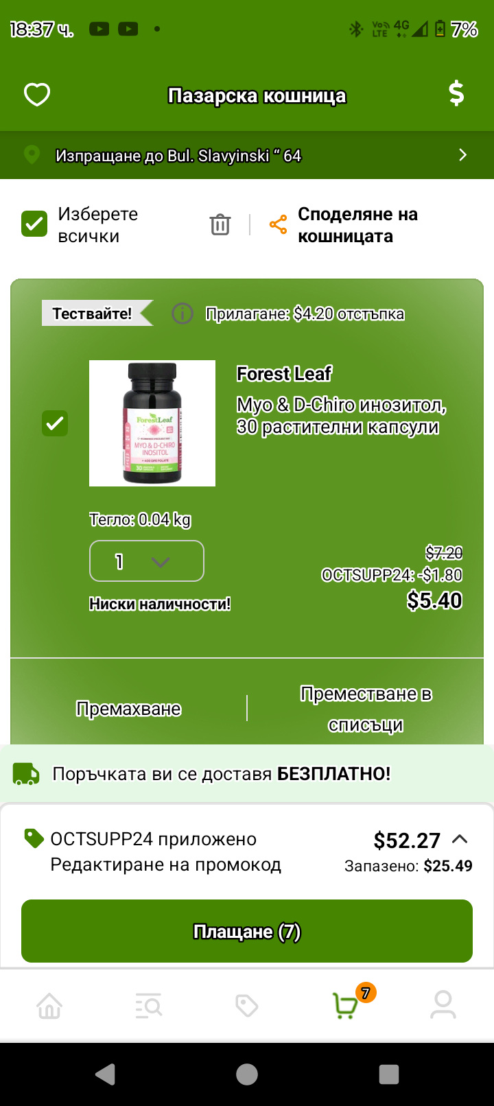 Мини, имам инозитол за 2 месеца напред, но не издържах на изкушението. При мен си излезе 5.49 лева за една бройка, взех си и втора, която вече е 11.87 лева. Реших да взема и от тестовете за О + Б на Easy@Home, че във форума много ги хвалите и тях. Благодаря ти, че сподели за промоцията! Heart