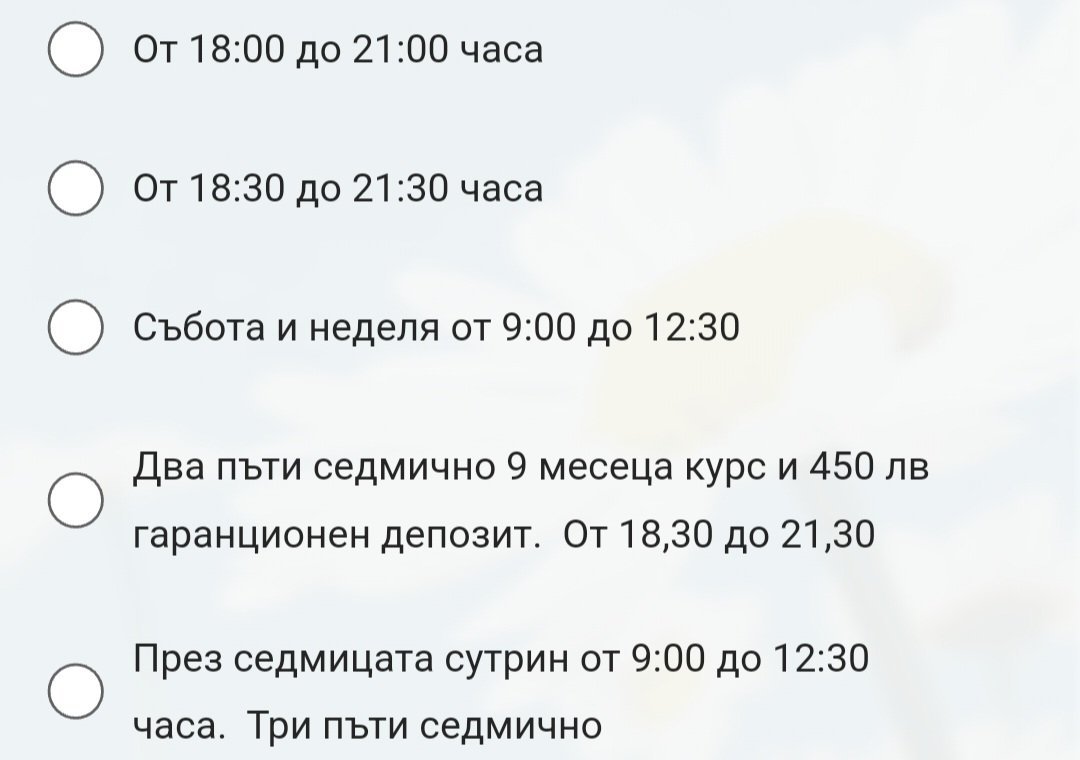 Някой някъде беше пуснал един техен мобилен. И на мен така ми казаха, че към ноември - чакат да се съберат групите и ще;ли да пуснат анкети кой кога иска и може да присъства в часовете. Доста любезни бяха.