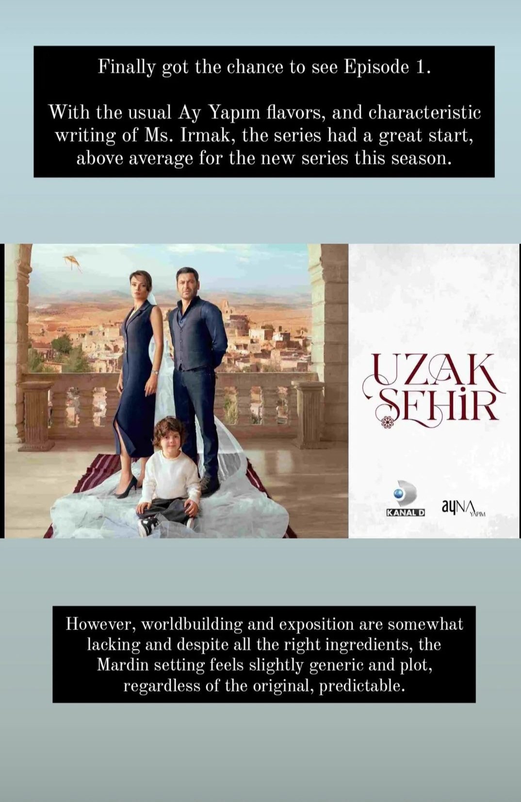 С обичайните вкусове на Ay Yapim и характерното писане на г-жа Ирмак, сериалът имаше страхотен старт, над средното за новите сериали този сезон.