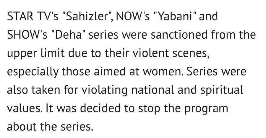 Две спирания на програми и 3% административна глоба бяха дадени на Star TV за сериала Sahibsizler, на NOW TV за сериала "Yabani" и на Show TV за сериала "Deha".