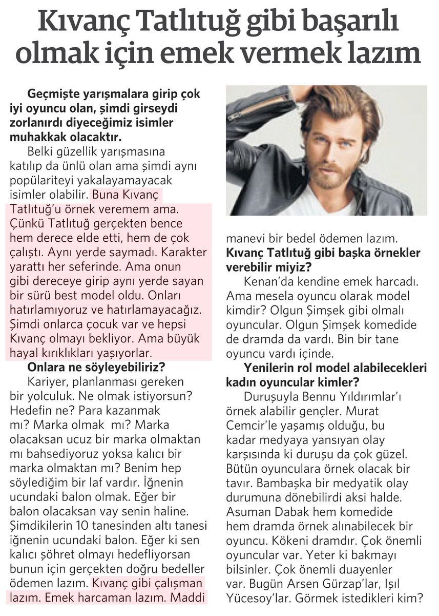 Може би има имена, които са известни с участието си в конкурси за красота, но те не могат да бъдат толкова популярни. Това не се отнася за Къванч Татлъту. Защото аз действително смятам, че той едновременно и достигаше височини и работеше страшно много. Той не стоеше на едно място. Всеки път създаваше нови образи. Имаме и други добри модели, които са тръгнали от тази позиция, но си стоят на едно и също място. Ние не ги помним и няма да ги помним. Сега има десетки младежи, които искат да станат като Къванч. Но изпитват големи разочарования.