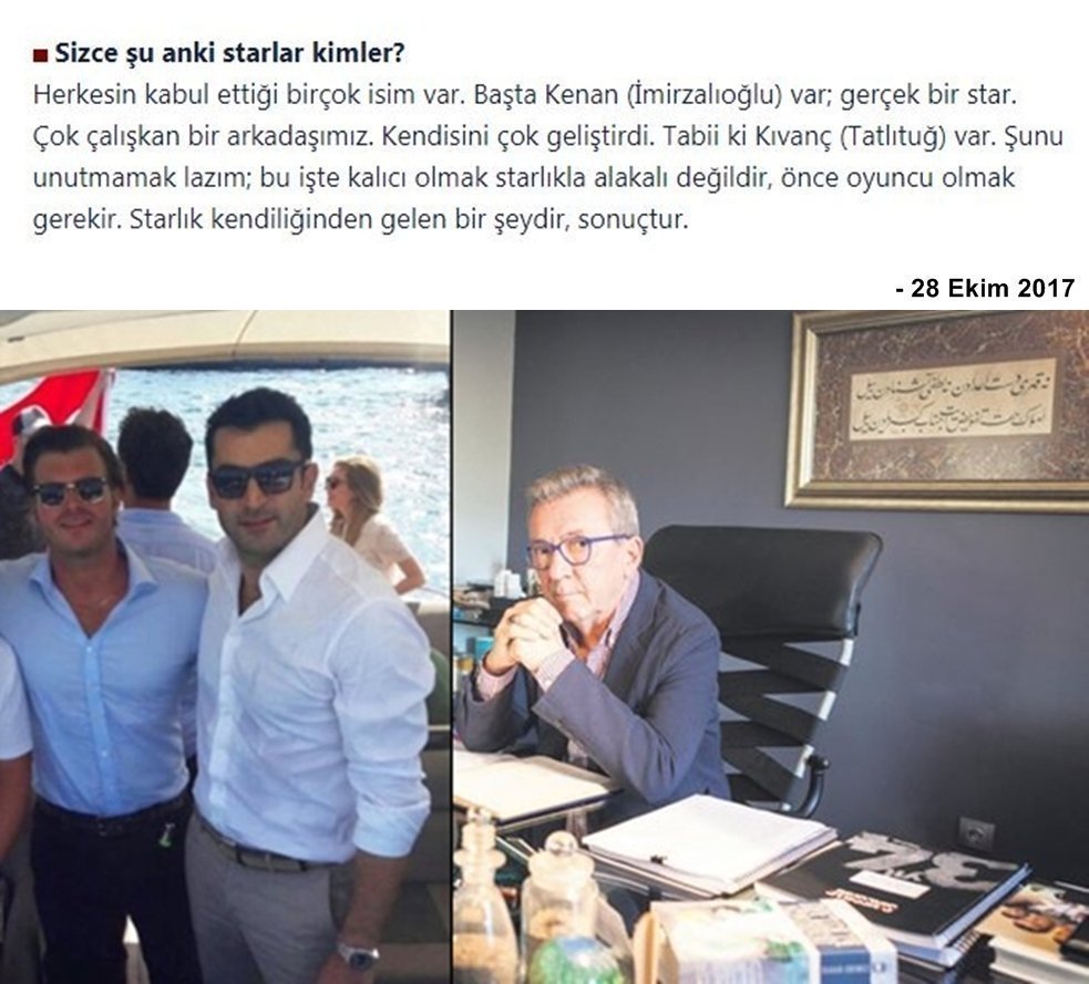 "Всеки счита за звезда определен човек . За начало бих назовал Кенан (Имирзалоулу), това е истинска звезда. Той е голям работяга. Силно разви своя талант. Разбира се, има го и Къванч (Татлъту). Не бива да се забравя, че в тази професия, може да се задържиш, разчитайки не на известността си, а само на своя актьорски талант. А звездността ще си дойде сама, тя е само резултат от твоята работа."