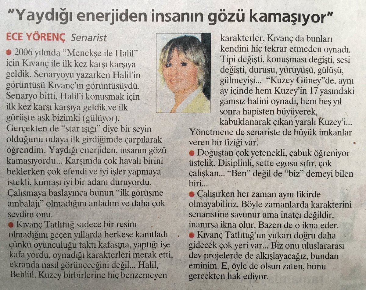 2. През последните години Kъванч Taтлъту показа на всички, че е не само красиво лице, тъй като той просто беше обсебен от актьорското майсторство, трудеше се над ролите си, беше очарован и запленен от героите си и не мислеше за това как изглежда на екрана. Халил, Бехлюл и Кузей изобщо не си приличат, Къванч ги изигра без изобщо да се повтаря. Неговият стил, говор, глас, стойка, походка, смях, усмивка винаги се променят ... В "Кузей Гюней“ за един месец той успя да изиграе безгрижната 17-годишна младост на Кузей и неговата подрастваща възраст, и Кузей след пет години в затвора, които получи и преживя много рани. Той има това телосложение и външност, които дават големи възможности едновременно и на режисьори и на сценаристи.