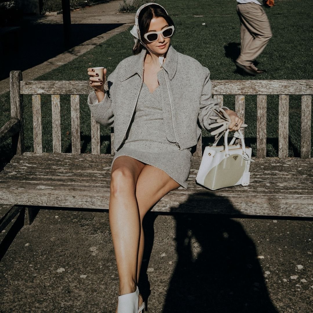 На едната Башак държи касета с плодове, на другата чанта Prada ,но