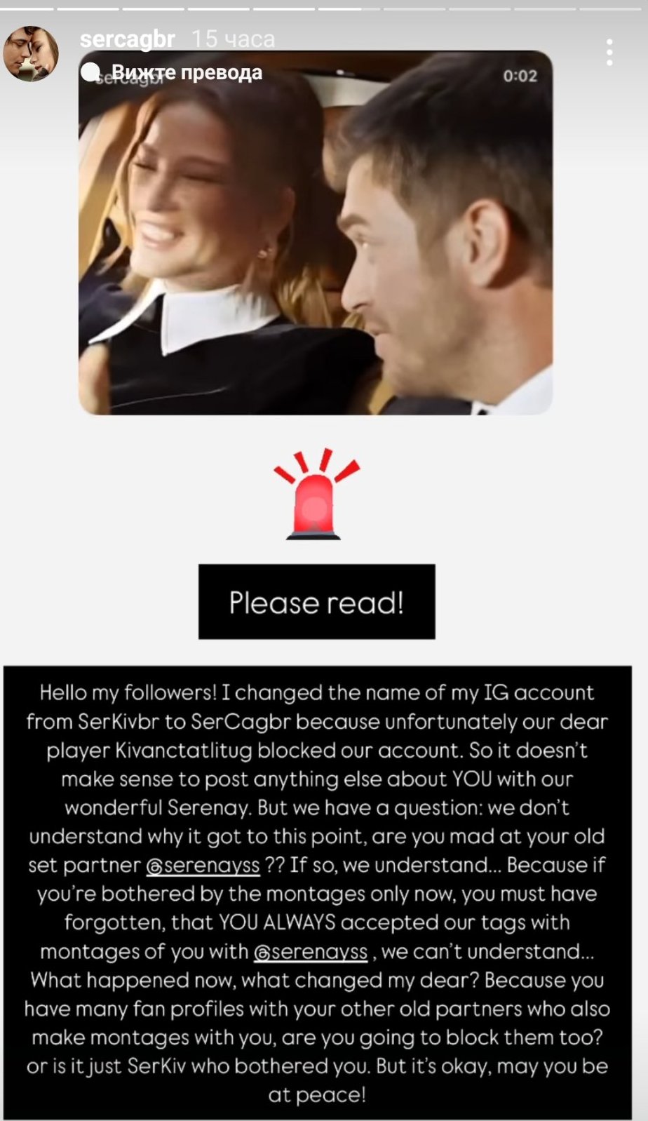 нямам представа Къванч колко време прекарва в ИГ, какво чете, чете ли фенски профили, казвал е, че не си пада по СМ. Но да се занимава да блокира някои фенове свързани със Серенай, искрено се съмнявам. Thinking просто е над тия неща. а и според мен те имаха страхотно партньорство, като се сетя как се прегърнаха на финала на снимките. и да й е сърдит...за какво?? абе много луди фенове има. колко много правят колажи с него и Берен и не ги е блокирал....