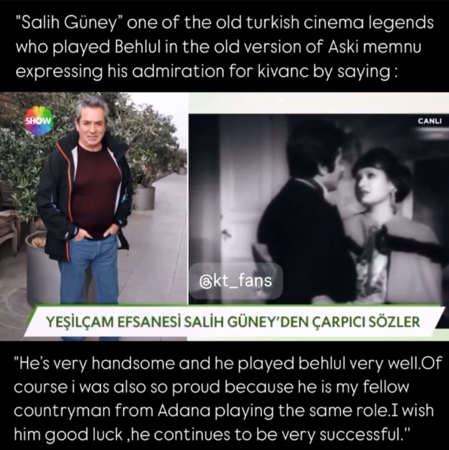 „Салих Гюней“ една от старите легенди на турското кино, който изигра Бехлюл в старата версия на Aski memnu, изразявайки възхищението си от Къванч, като казва: