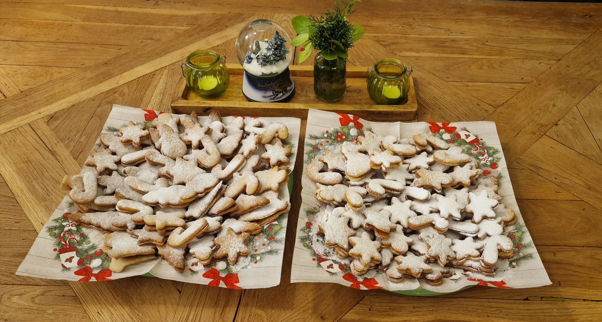 Изрязват се формички и се пекат в загрята на 180°, докато порозовеят.