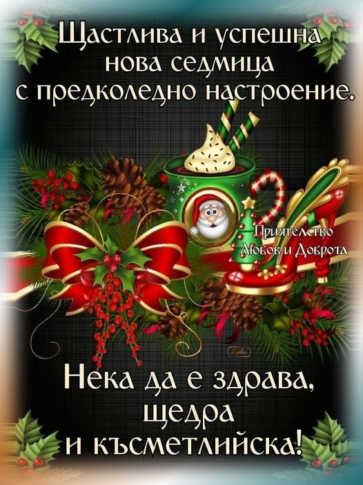 Изморих се, но всичко е готово и за утре и дори за Коледа, макар, че ще се събираме всички налични от семейството в ресторант на 25 - ти на обяд, заради татко го правим вече така няколко години, не издържа вече дълго гостуване вкъщи. А си имаме цели трима именяци, татко, големия ми син и синът на сестра ми, но за съжаление с тях ще се поздравим по телефона тази Коледа. И добре, че синчетата днес не са на работа и ме изненадаха сутринта, та те пазаруваха, рязаха продуктите за руската салата, малкия направи баницата/ прави я по-хубаво от мен /, големия баклавата, да са ми живи и здрави, златни са ми! Heart