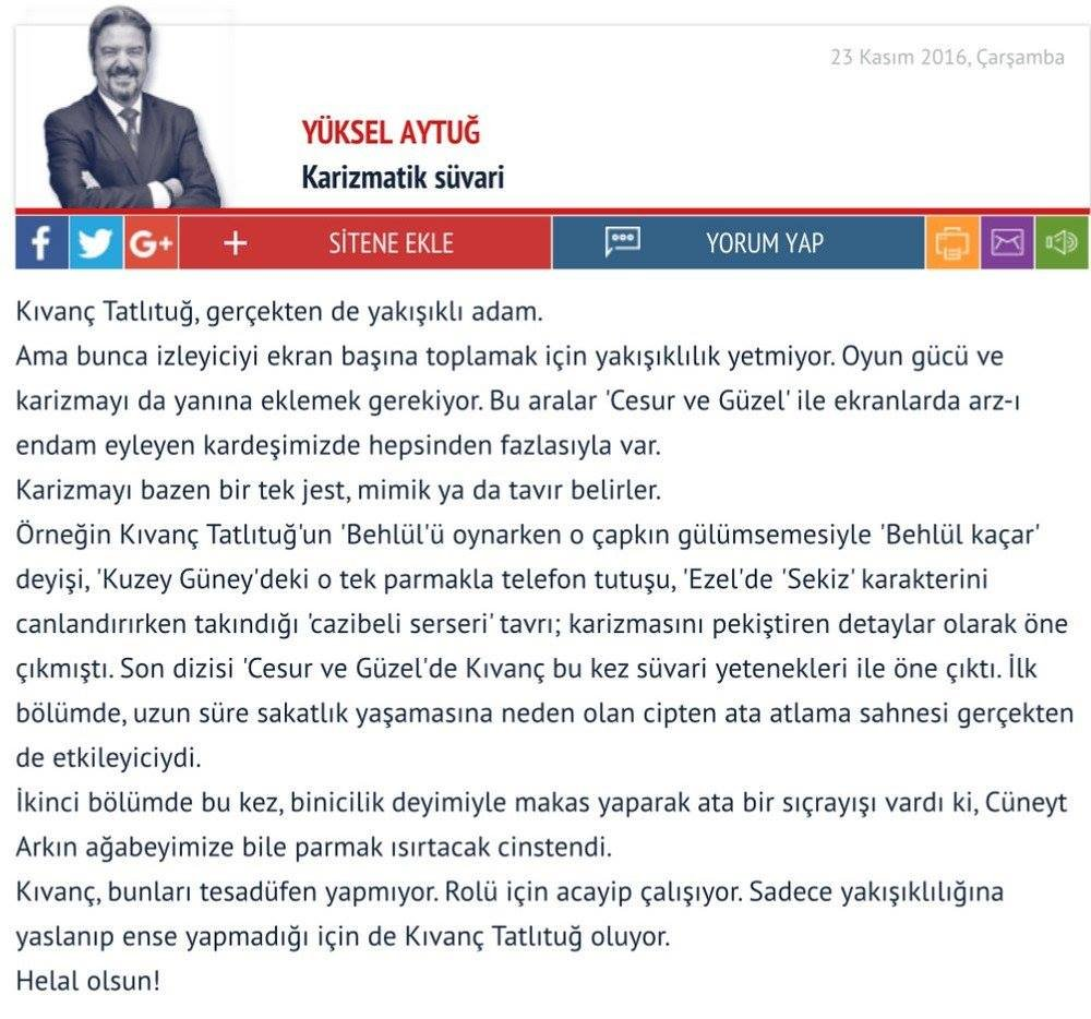 КГ е 4- тия в кариерата на Къванч, ако не броим краткото му участие в "Езел" като гост-актьор, където се доказа на всички, че вече е актьор, който може да играе всякакви роли. Разбира се, че ще има възход, той работеше без почивка цели 10 години и с всеки следващ проект ставаше по-добър. Киво винаги влага всичко на което е способен във всяка роля, но, определено в тази се раздаде наистина без остатък, личеше му колко много харесва героя си Кузей, а и самата история.