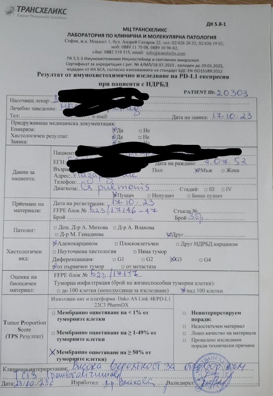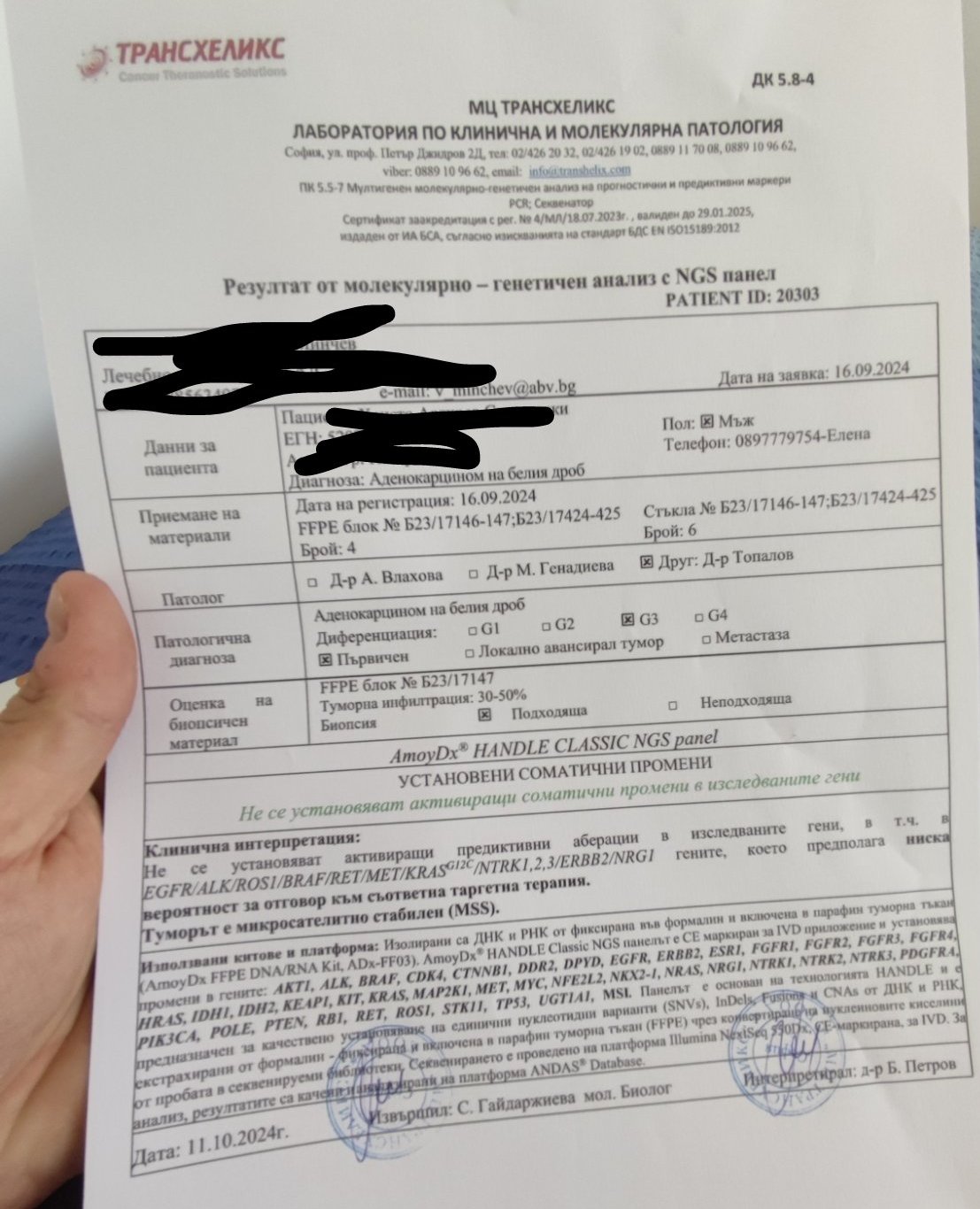 Накратко - биопсия, резултат сваматозен плоскоклетъчен карцином. Диференциация G3, PD-L1 3%. Пускахме всякакви мутации, ясно беше - отрицателни са.