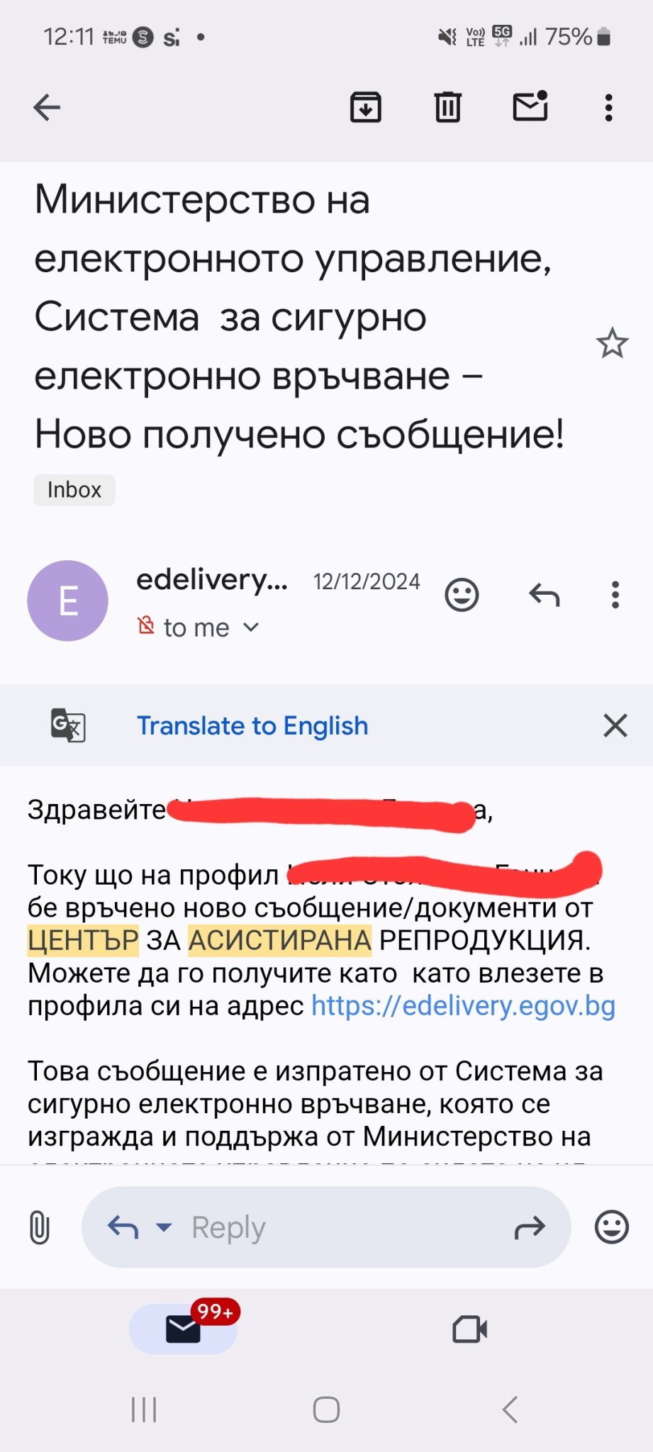 Получаваш имейл, в който пише, че имаш ново съобщение от Центъра за асистирана репродукция. Ето така: