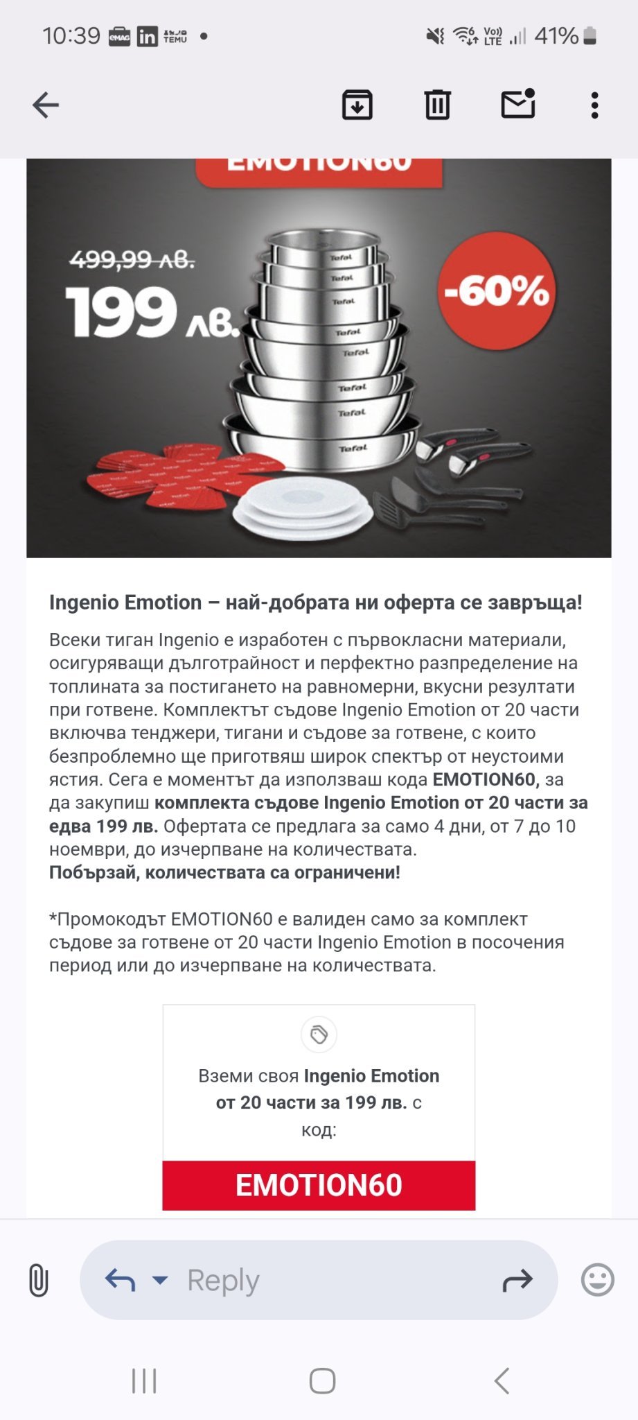 Някой търсеше тигани и/или тенджери. Ето оферта на Тефал. Не е точно за черен петък, но пак е добра оферта. Поне според мейла. Не знам дали стандартно са на тази цена, от която намалят.