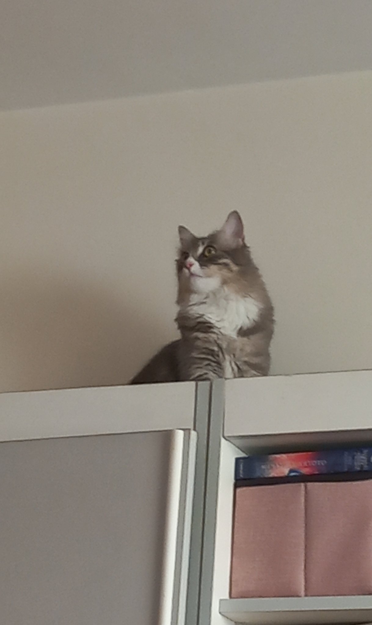 В хола се катери и по - високо, но там умишлено направихме етажерки, на различни височини, точно с тази цел да си се катери, така го замислих още преди да си я вземем. Майстора ни се смееше на щуротиите като му рисувах кое как го искам щото ще имаме коте, ама идея няма колко практично е всичко за Линош. Да обаче това в стаята не беше предвидено и до тези дни беше недостижимо, ама... ще се правят нови промени и подредби няма как, здраве да е!