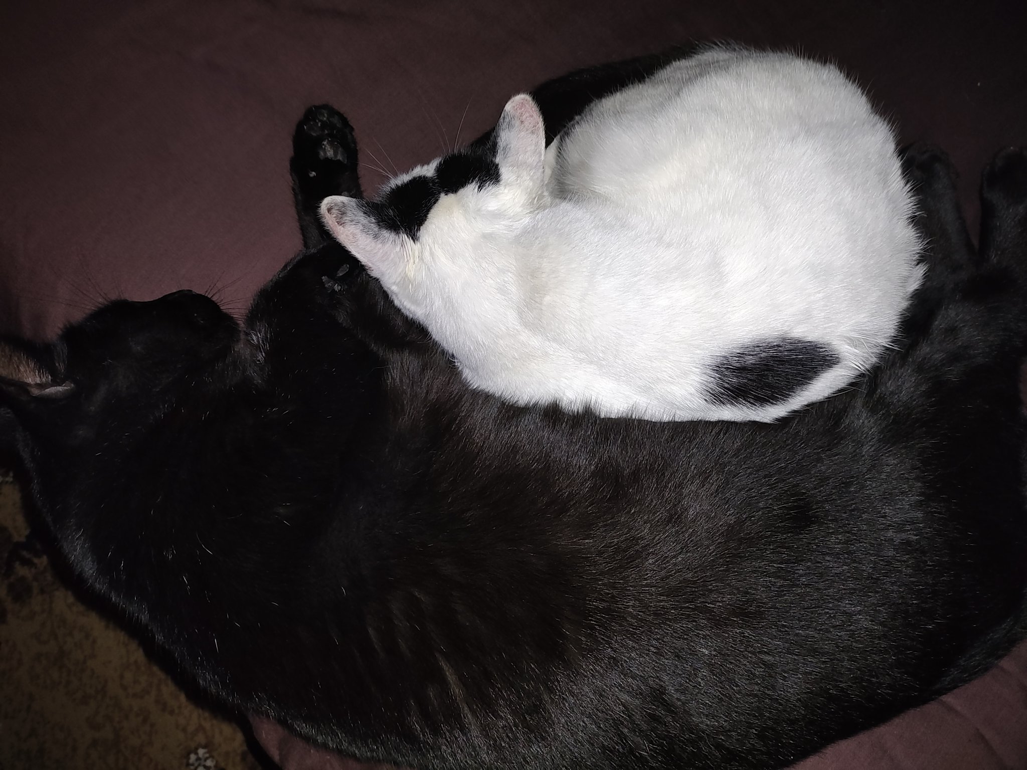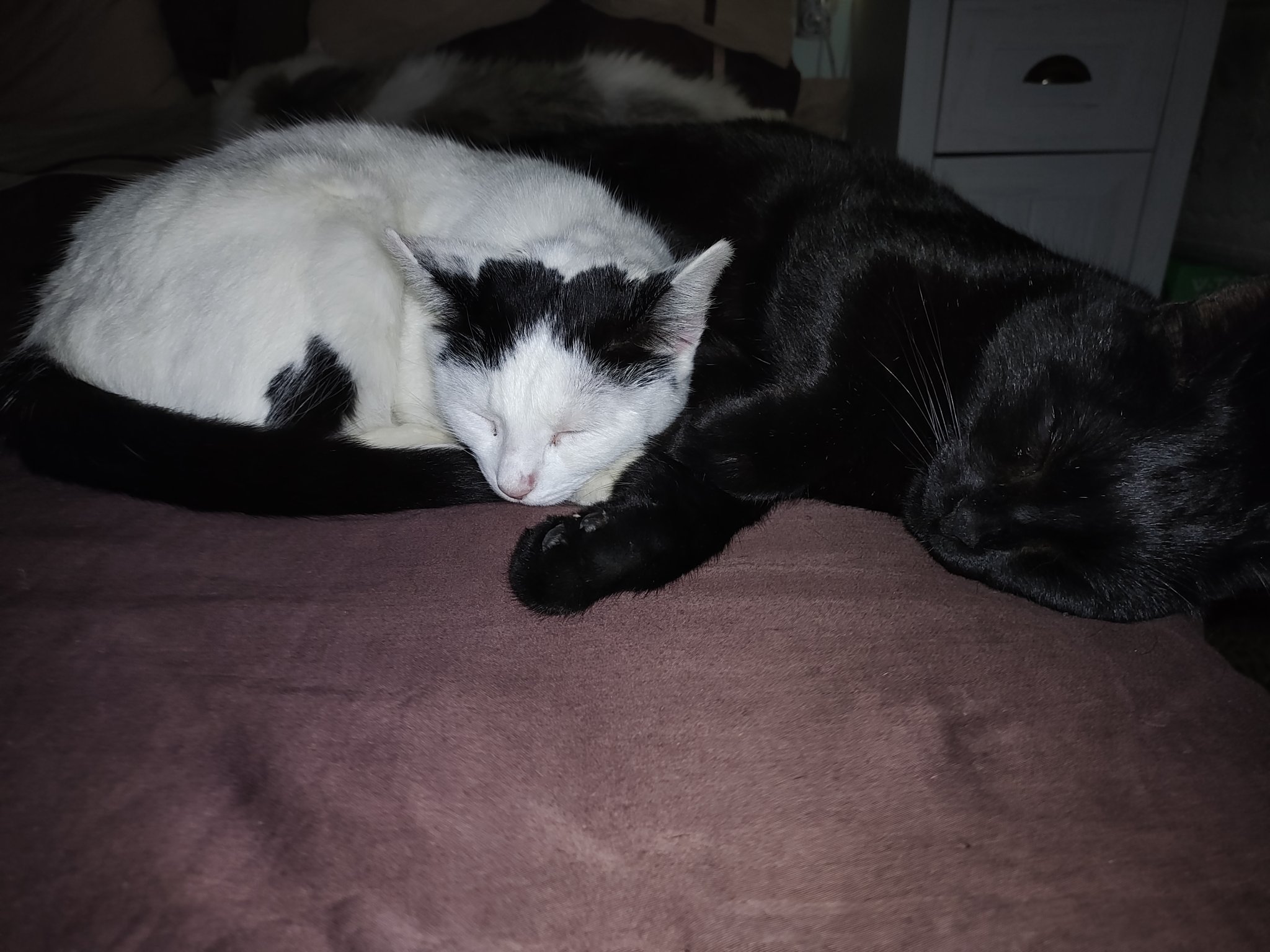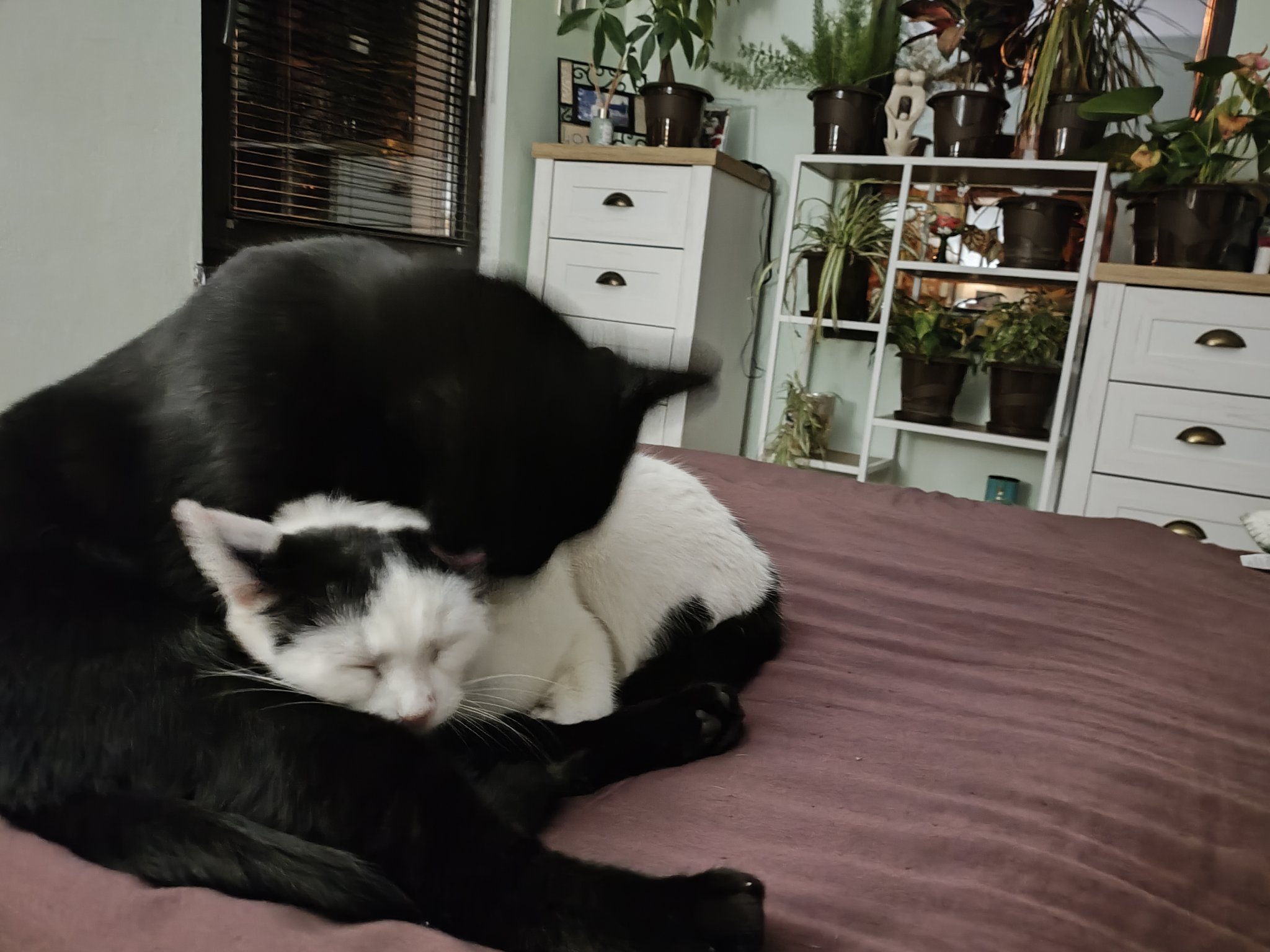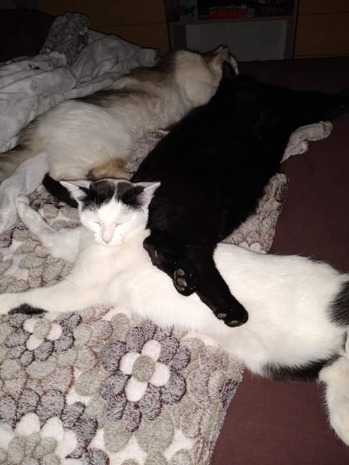 На мен ми е жал за Лео, тримата големи са в спалнята - той сам в трапезарията до камината. Сега се качи ба леглото, Чери го наблюдава па заспа, Точка изръмжа ближейки крак, а Памук се изнесе. То вярно, че е диване и малко перде, играе му се на детето, че яде като ламя, ама е добричко и незлобливо. Иска да го гушкат, милват и да си играят с него. Пък дъртите нищо не разбират!