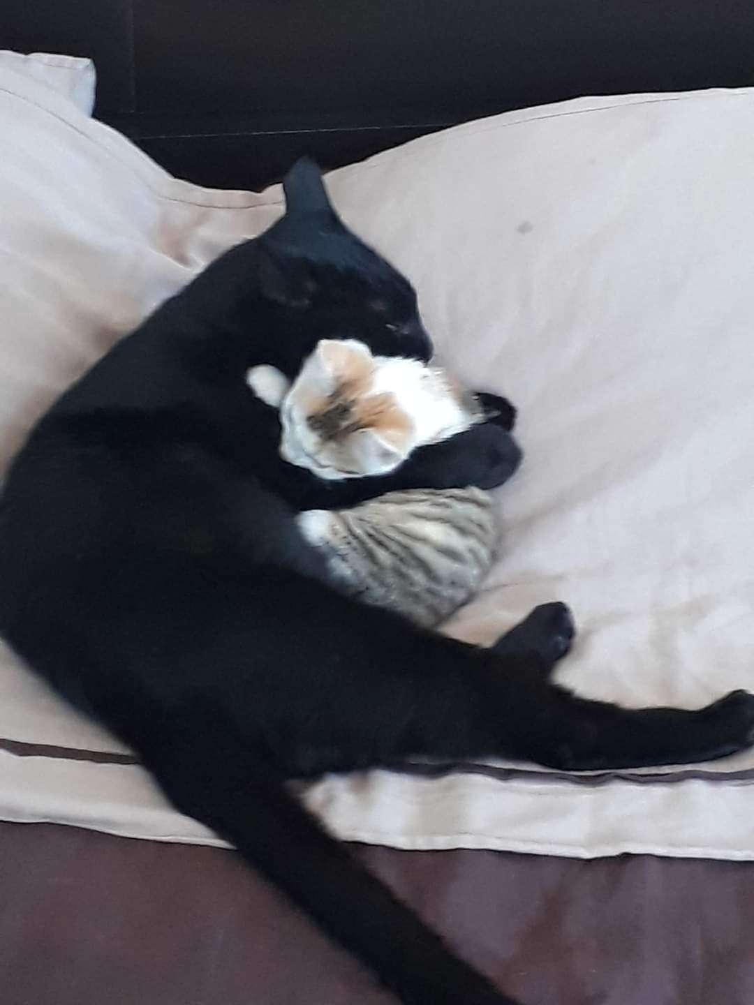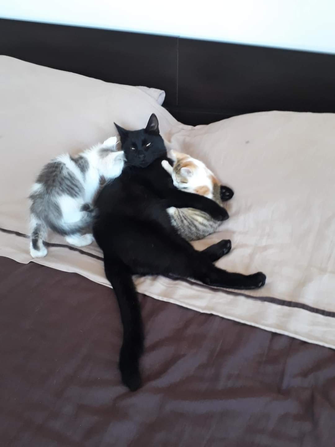 В интерес на истината го взех по молба на малкият ми син, бях ви разказала, как го е купил с джобни стотинки, от деца които са го мъчили. А Чери беше почти без козина - само бълхи. По пътя за вкъщи минахме през ветеринар ( точно на нашата улица). А сина ми се обади на баща си, да ни чака там. Мъжът ми обожава черни котки. Та , ветеринаря напръска обилно с нещо Чери, уви го в пелена, за да се задушат бълхите и то бебето заспа. Подадох го като новото на мъжа ми с думите - честит ти син. Той го погледна и си го взе. И понеже Кети трудно го преживя, а Чери беше мега бяс, бях решила да го дам на една майка на съученик на сина. Сина плака да не го давам. И не го дадох. Скоро, след години ми каза - искаше да го дадеш на майката на един от мъчителите му.
