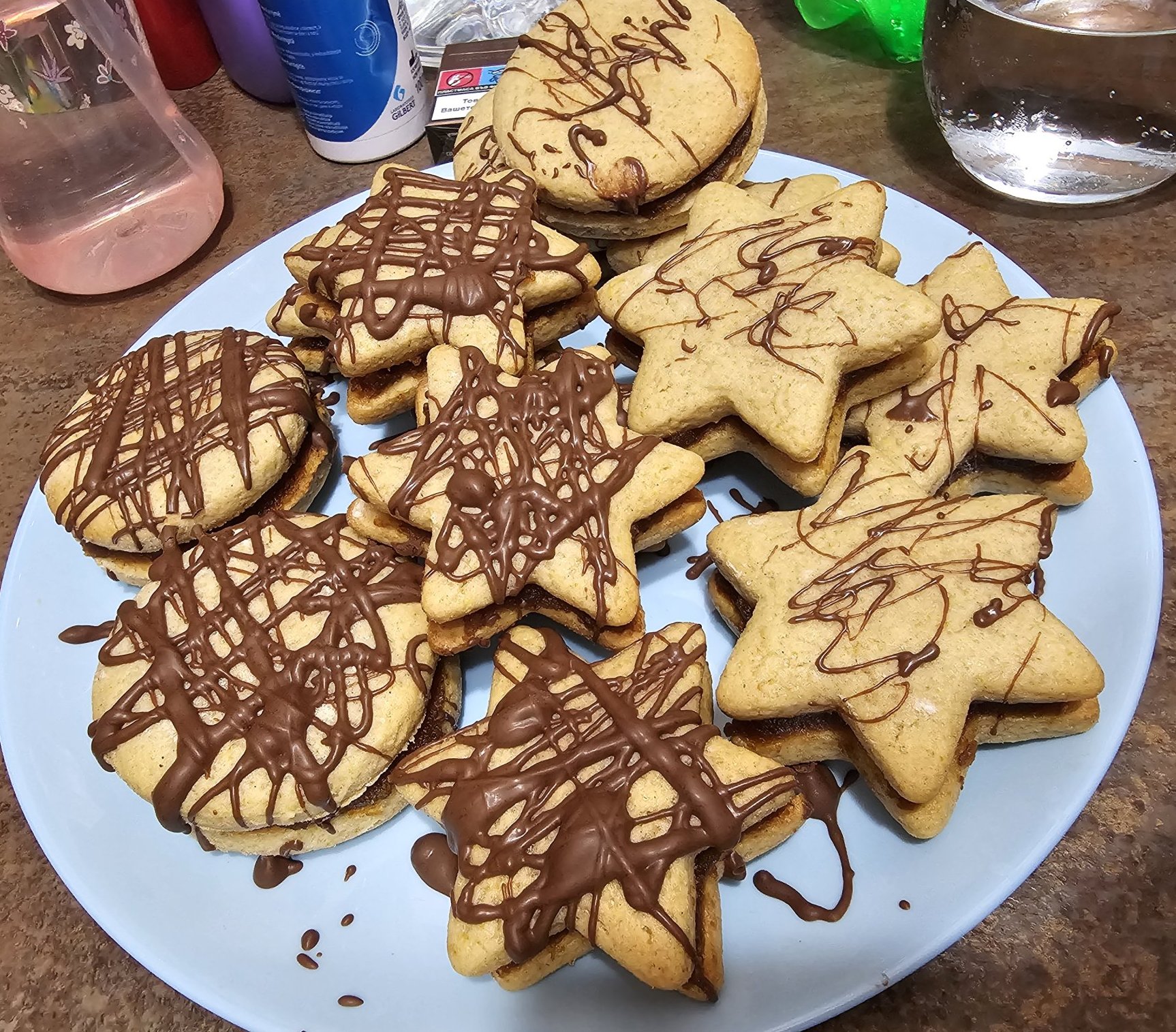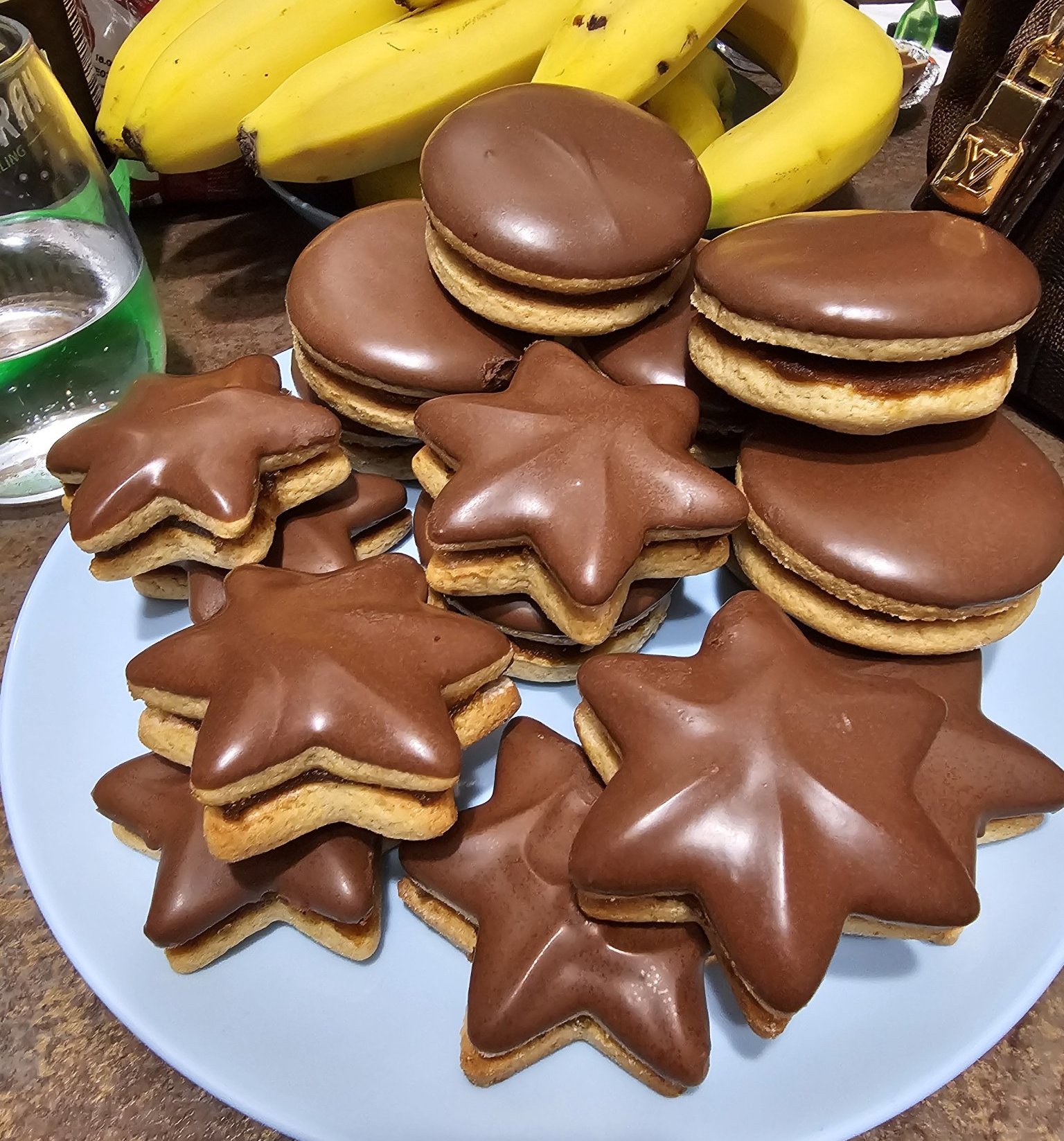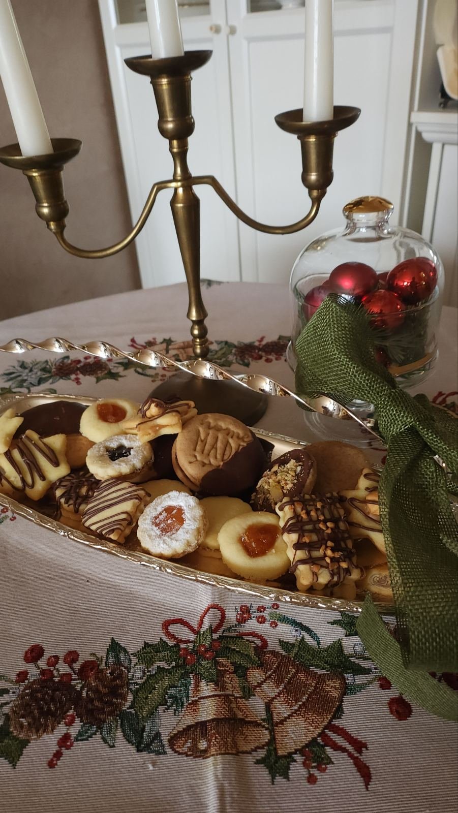 Платото включва Алфахорес, меденки с два вида мармалад и шоколад, бисквити с фъстъчен крем, виенските бисквити, декорирани с шоколад, ядки и домашни озахарени портокалови корички, линцери и ангелски очи (може и да пропускам нещо, че мозък не остана с този зъб). Апропо, ангелските очи са оранжеви и странни на вид, защото се оказа, че съм отворила бурканче с печените ми праскови за други десерти, а не с конфитюр, ама ги ползвах, стана вкусно поне: